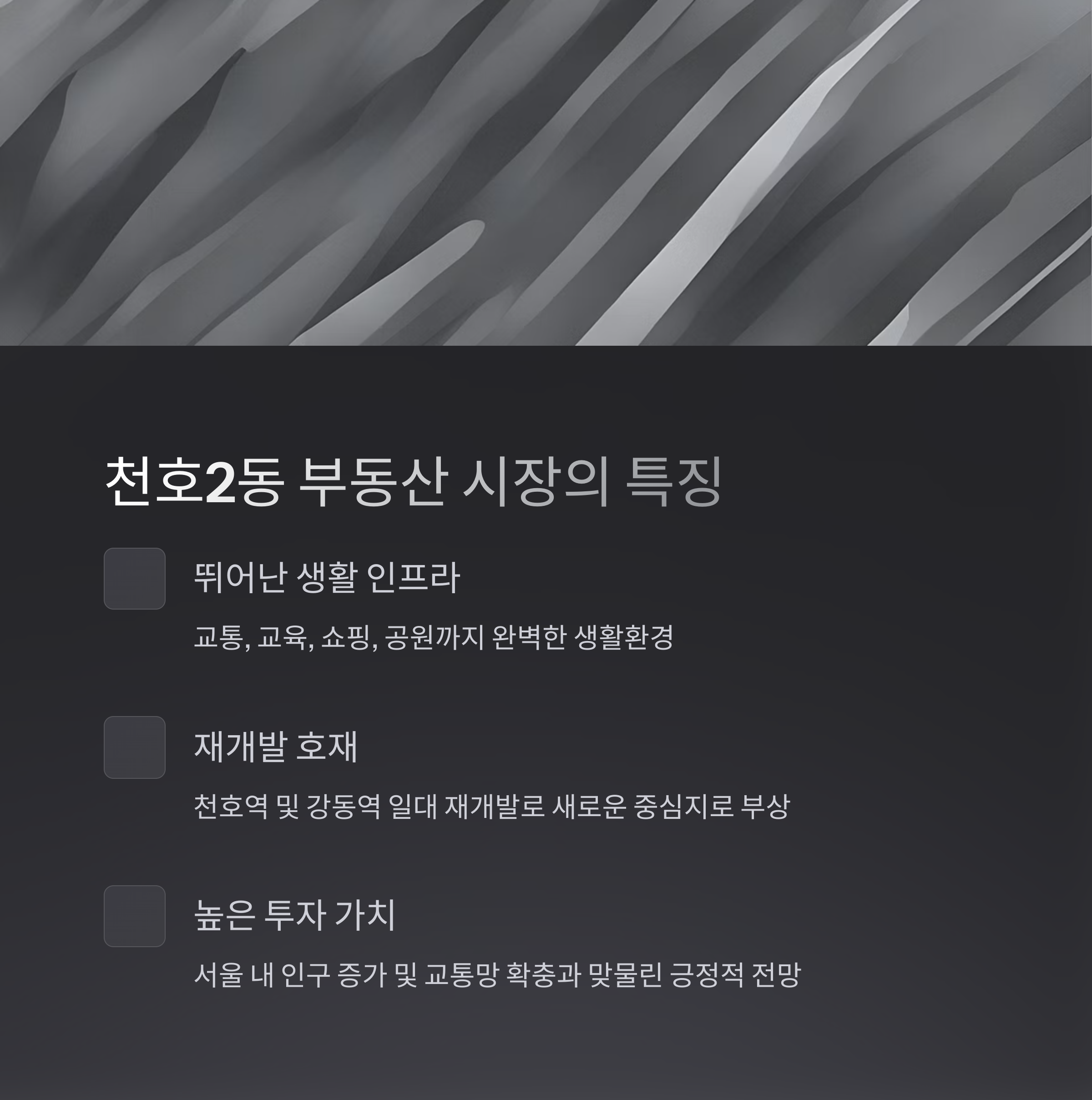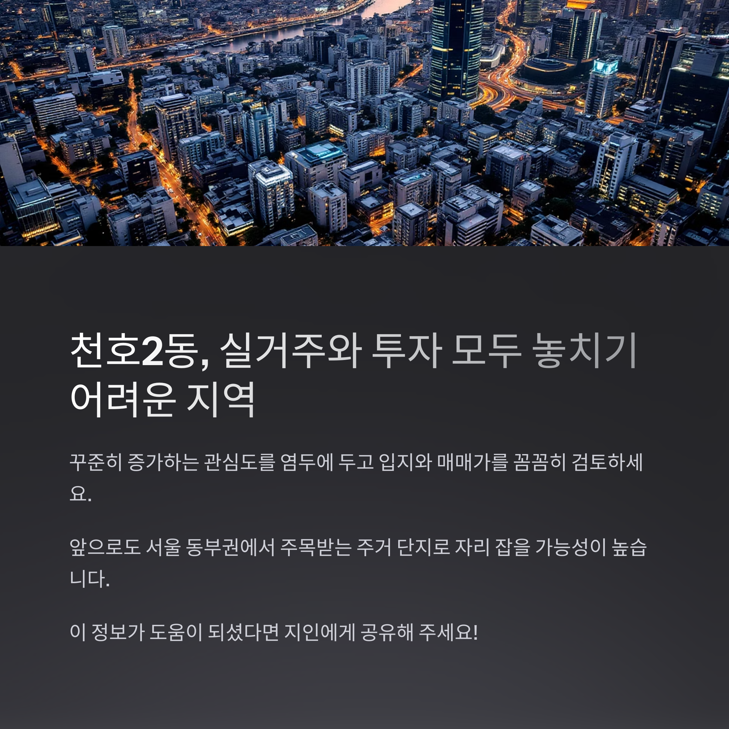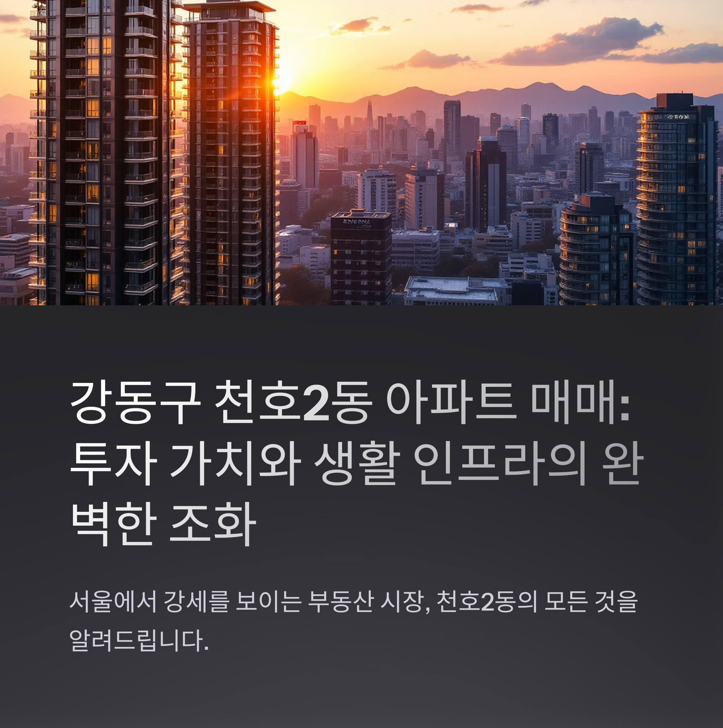 결론적으로, 천호2동은 실거주와 투자 가치 모두 놓치기 어려운 지역이라고 할 수 있습니다. 강동구 천호2동 아파트 매매를 고민하신다면 꾸준히 증가하고 있는 관심도를 염두에 두고, 입지와 매매가 등을 꼼꼼히 검토하길 추천드립니다. 앞으로도 천호2동은 서울 동부권에서 주목받는 주거 단지로 자리 잡을 가능성이 높아 보입니다."