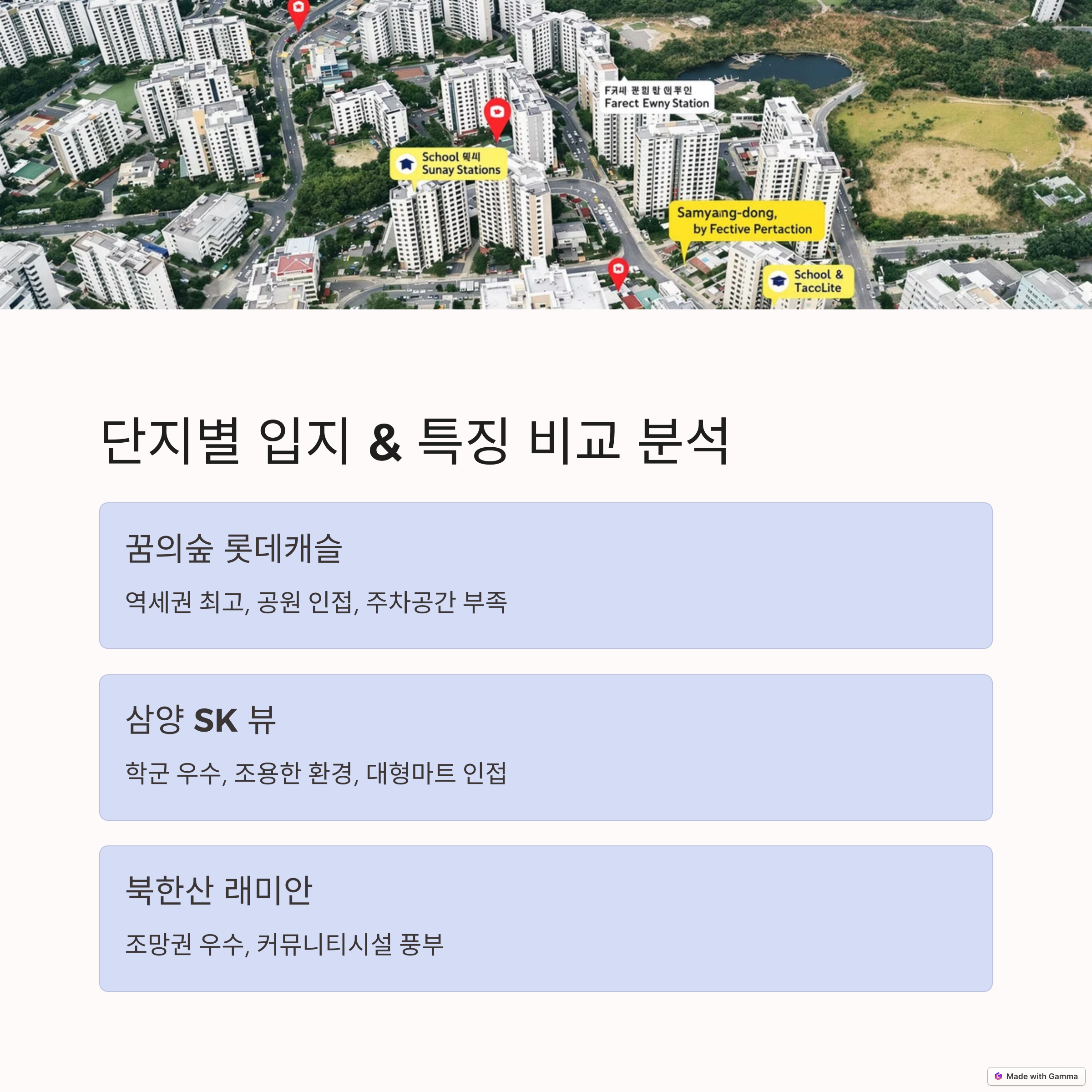 최근에는 삼양현대, 삼양이편한세상 등 안정적인 입지의 단지들이 주목받고 있으며, 실거주 및 임대 수익 모두 고려할 수 있는 단지로 평가받고 있습니다.