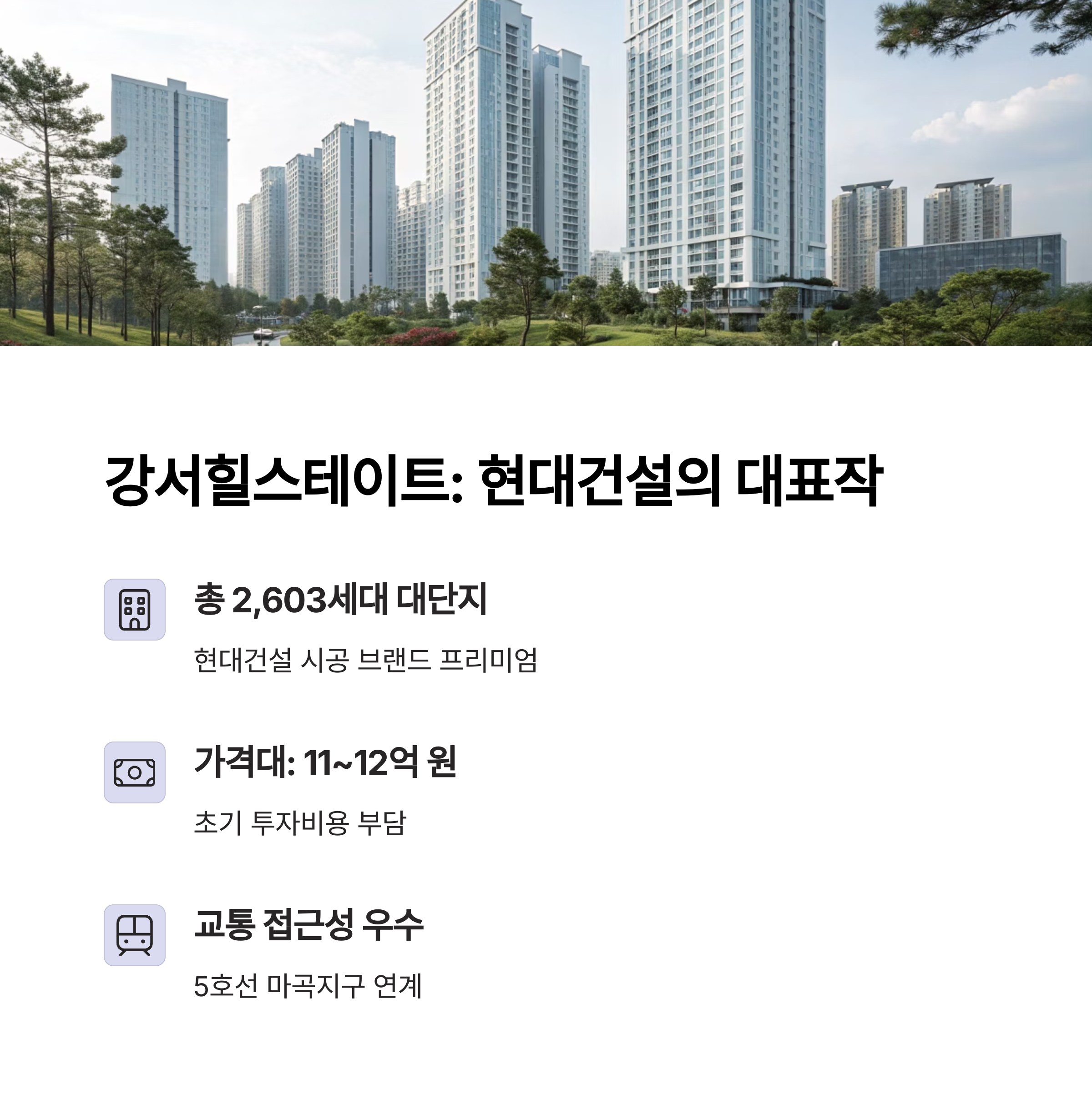 강서힐스테이트는 브랜드 파워가 높은 현대건설이 시공한 아파트로, 깔끔한 단지 구성과 최신식 설계로 입주민들의 만족도가 높습니다. 단지 내 커뮤니티 시설이 잘 되어 있어 편리한 생활이 가능하며, 특히 주변 녹지 환경과 가까워 쾌적한 거주 환경을 제공합니다. 또한 지하철 5호선 화곡역과 가까워 교통 접근성이 뛰어납니다.