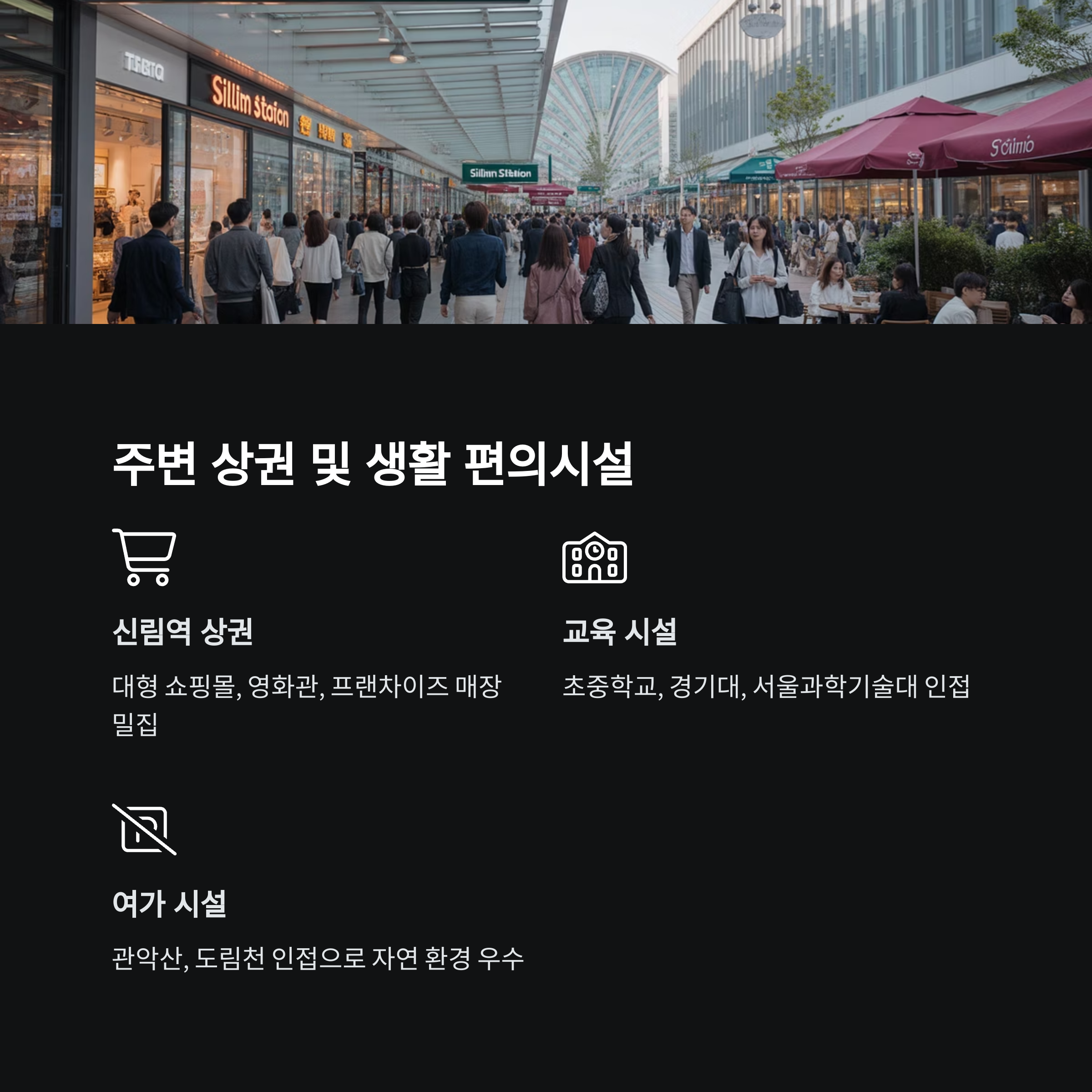 신림역과 가까운 성현동은 신림 상권을 쉽게 이용할 수 있는 장점이 있습니다. 신림역 주변에는 대형 쇼핑몰, 영화관, 프랜차이즈 매장, 카페 등이 밀집되어 있어 젊은 층 및 가족 단위 거주자들에게도 만족도를 높이고 있습니다.