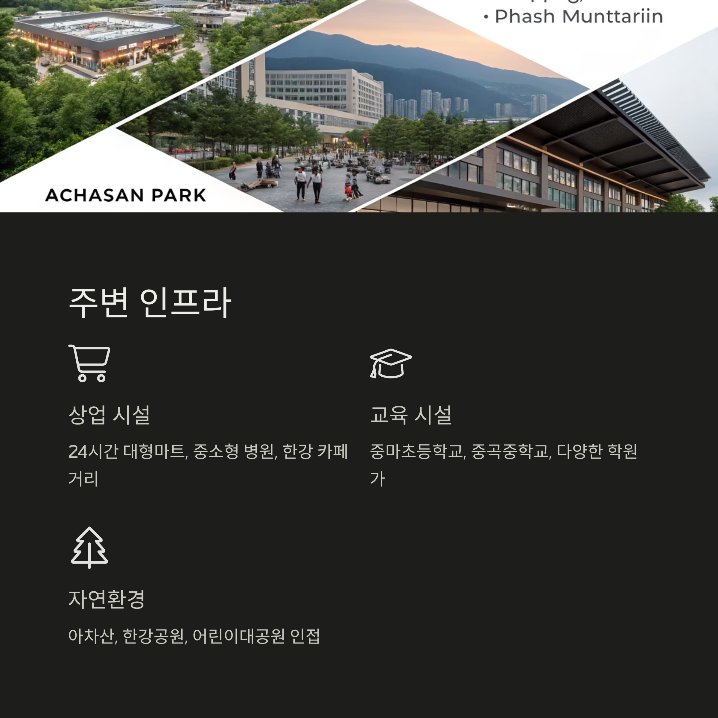 • 뛰어난 자연환경: 인근에 한강 자락길과 아차산이 있어 산책하기 좋은 환경