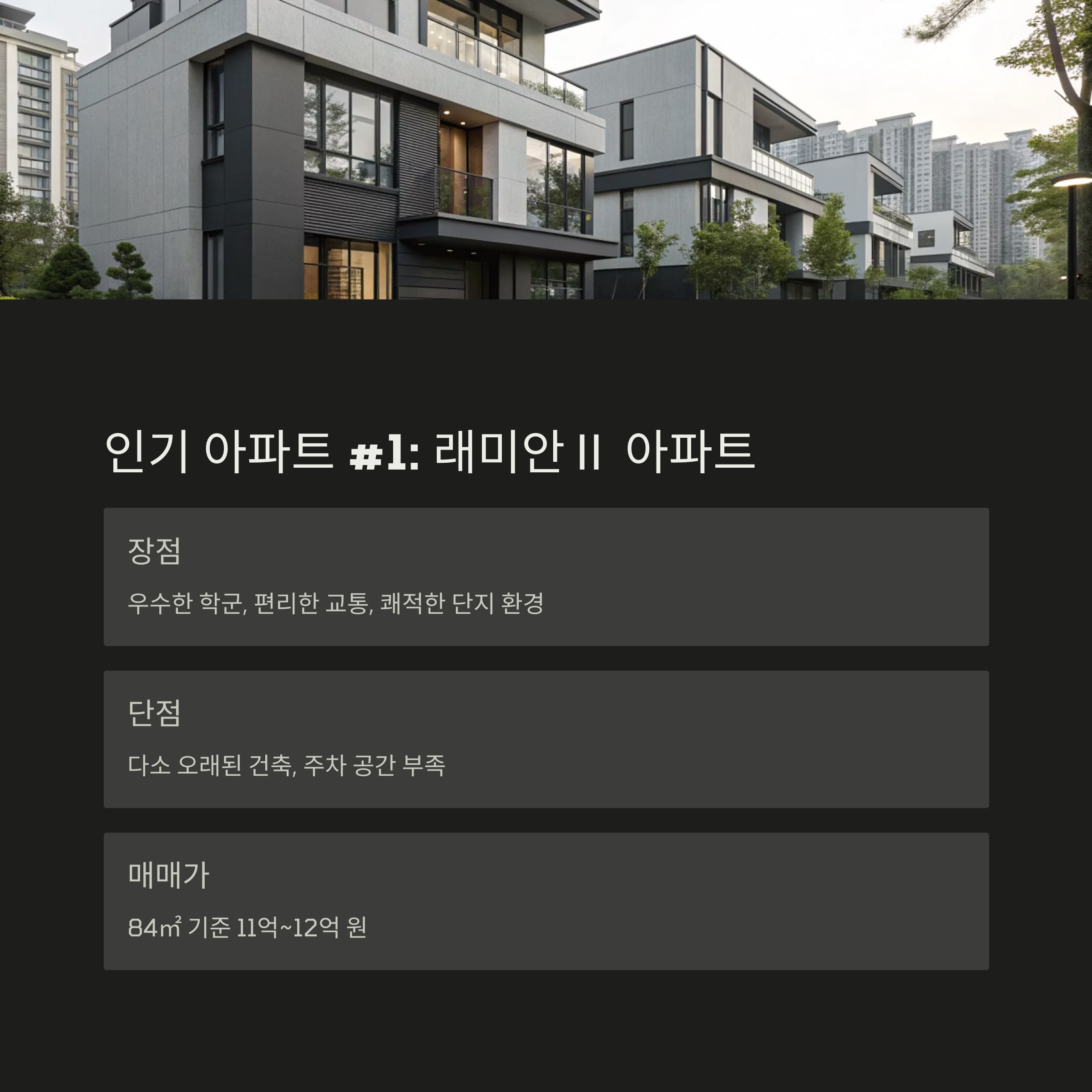 중곡2동에서 가장 선호도가 높은 단지 중 하나가 바로 래미안Ⅱ 아파트입니다. 2000년대 초반에 준공된 이 단지는 깔끔한 외관과 체계적인 관리 시스템으로 호평받고 있습니다. 특히, 주변에 중마초등학교중곡중학교가 도보 거리에 있어 학군 마련이 중요한 가구들에게 인기가 높습니다.