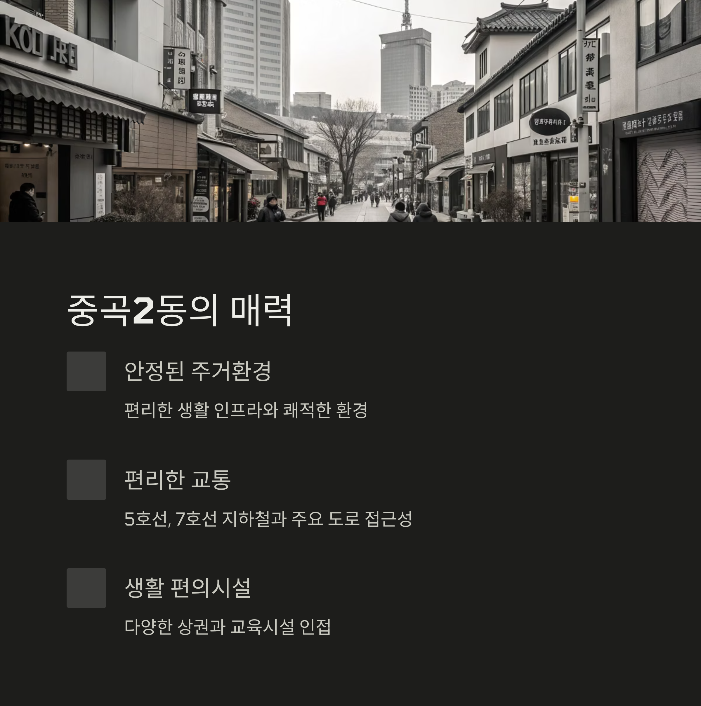 중곡2동은 초중고가 근거리에 위치하고, 어린이대공원, 건대 상권, 갤러리아포레 문화시설 등이 가까워 교육과 문화생활의 혜택을 동시에 누릴 수 있는 곳입니다. 이러한 요소들은 특히 가족 단위 거주자들에게 강한 매력으로 다가갑니다.