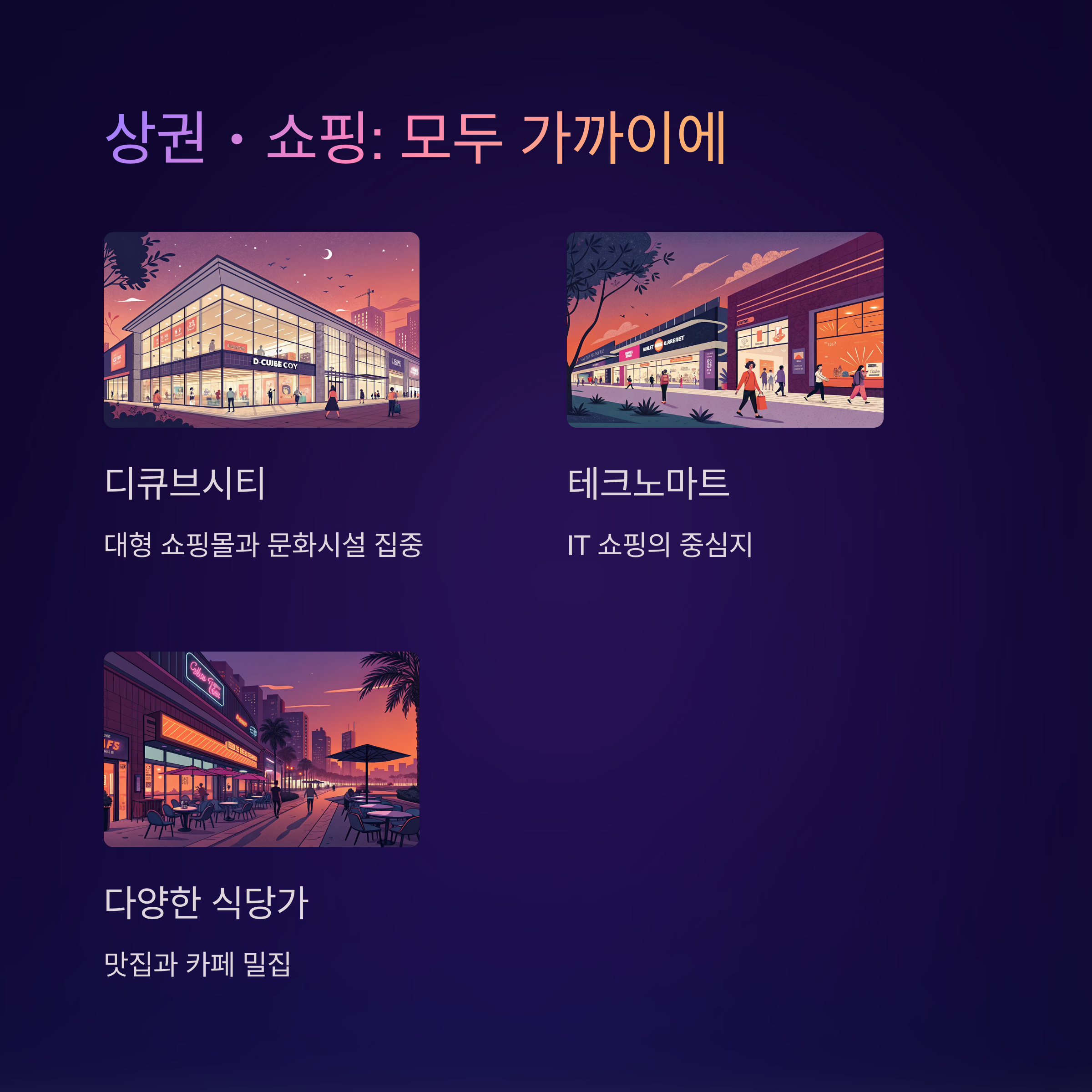 신도림동은 신도림 테크노마트, 디큐브시티, 현대백화점 같은 다양한 상업시설이 밀집해 있어 쇼핑, 여가 시설을 한 자리에서 이용할 수 있습니다. 특히 디큐브아트센터와 같은 문화 공간은 지역 주민들에게 업그레이드된 삶의 질을 선사하는 역할을 합니다.