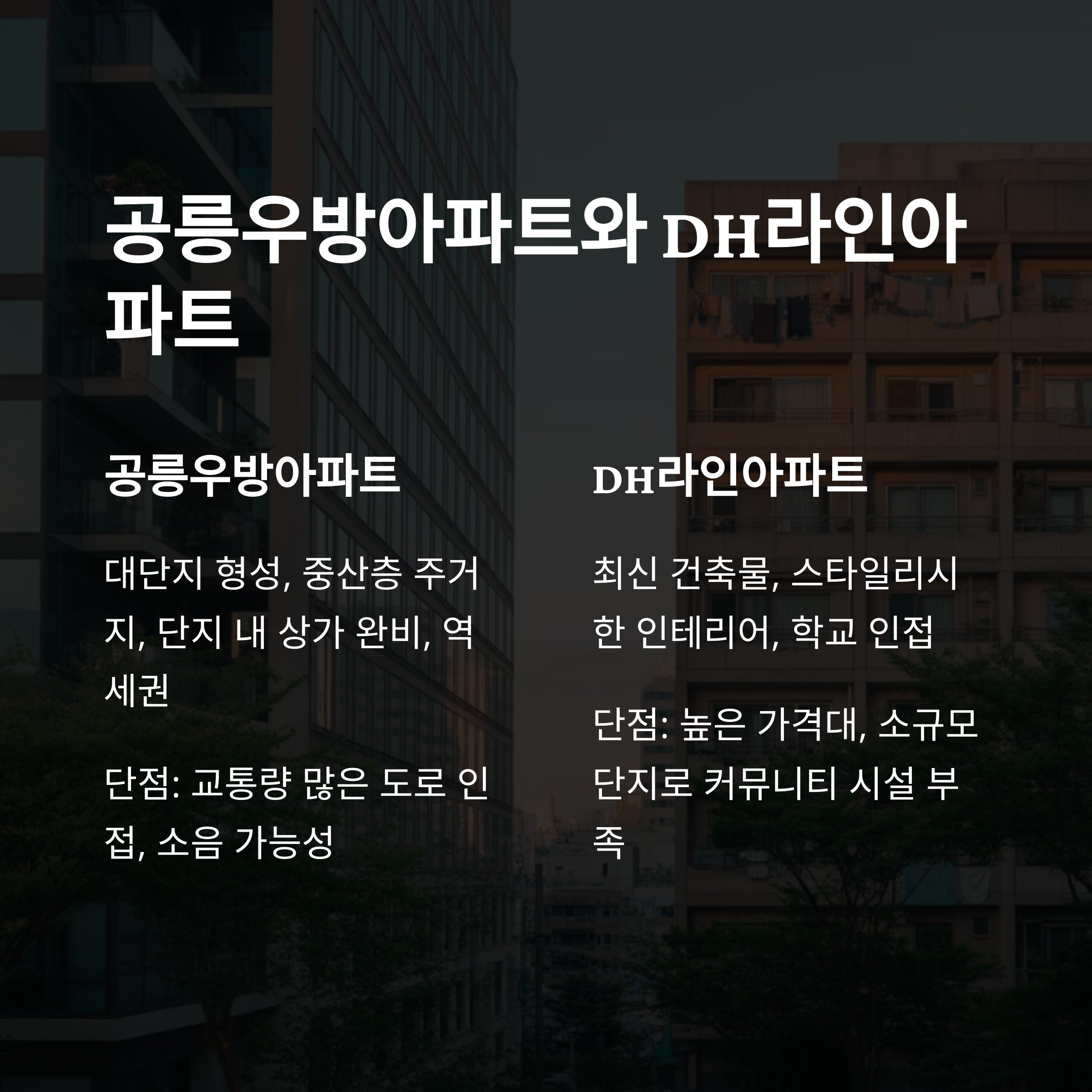 - 장점: 공릉우방아파트는 비교적 대단지로 형성되어 있고, 이 지역에서 안정적인 중산층 주거지를 대표하는 곳 중 하나입니다. 단지 내 상가와 편의 시설이 잘 갖춰져 있어 생활 편의성이 높습니다. 게다가 공릉역, 태릉입구역과의 접근성이 좋아 출퇴근이 용이합니다.