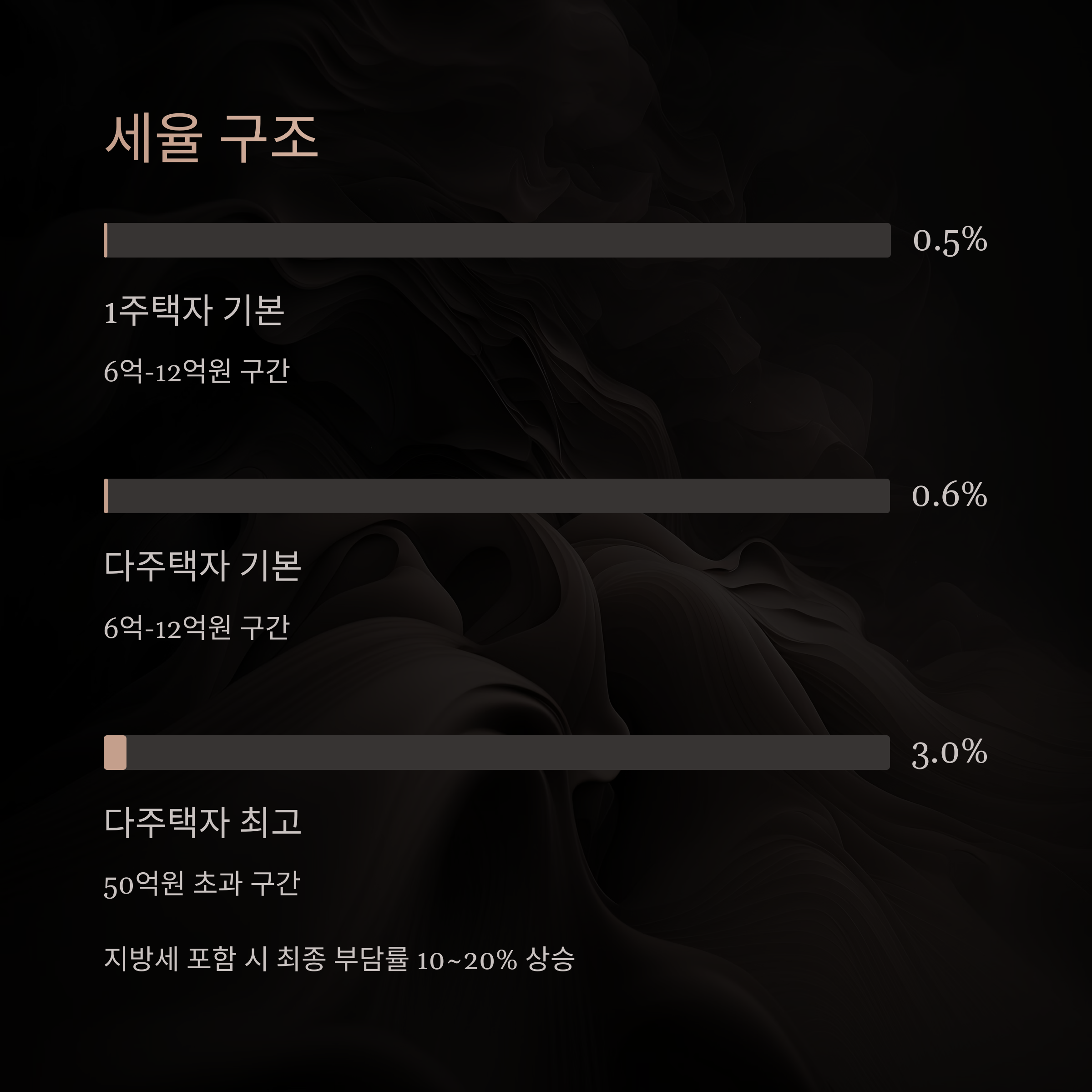 - 다주택자일수록 과세표준 대역별로 0.1%~0.3% 추가세율이 붙습니다.