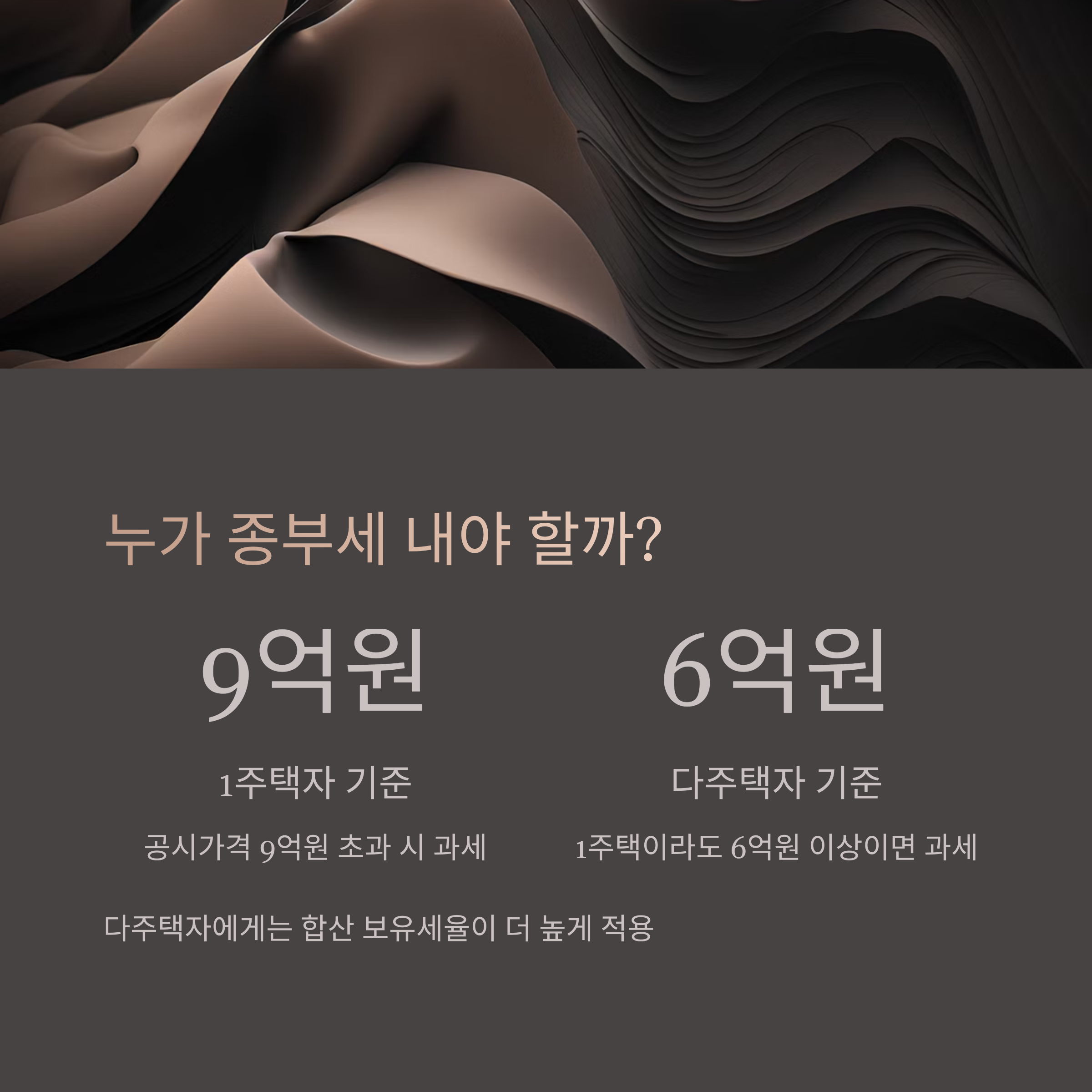 - 2주택자 이상(다주택자): 1주택이라도 6억원 이상이면 과세