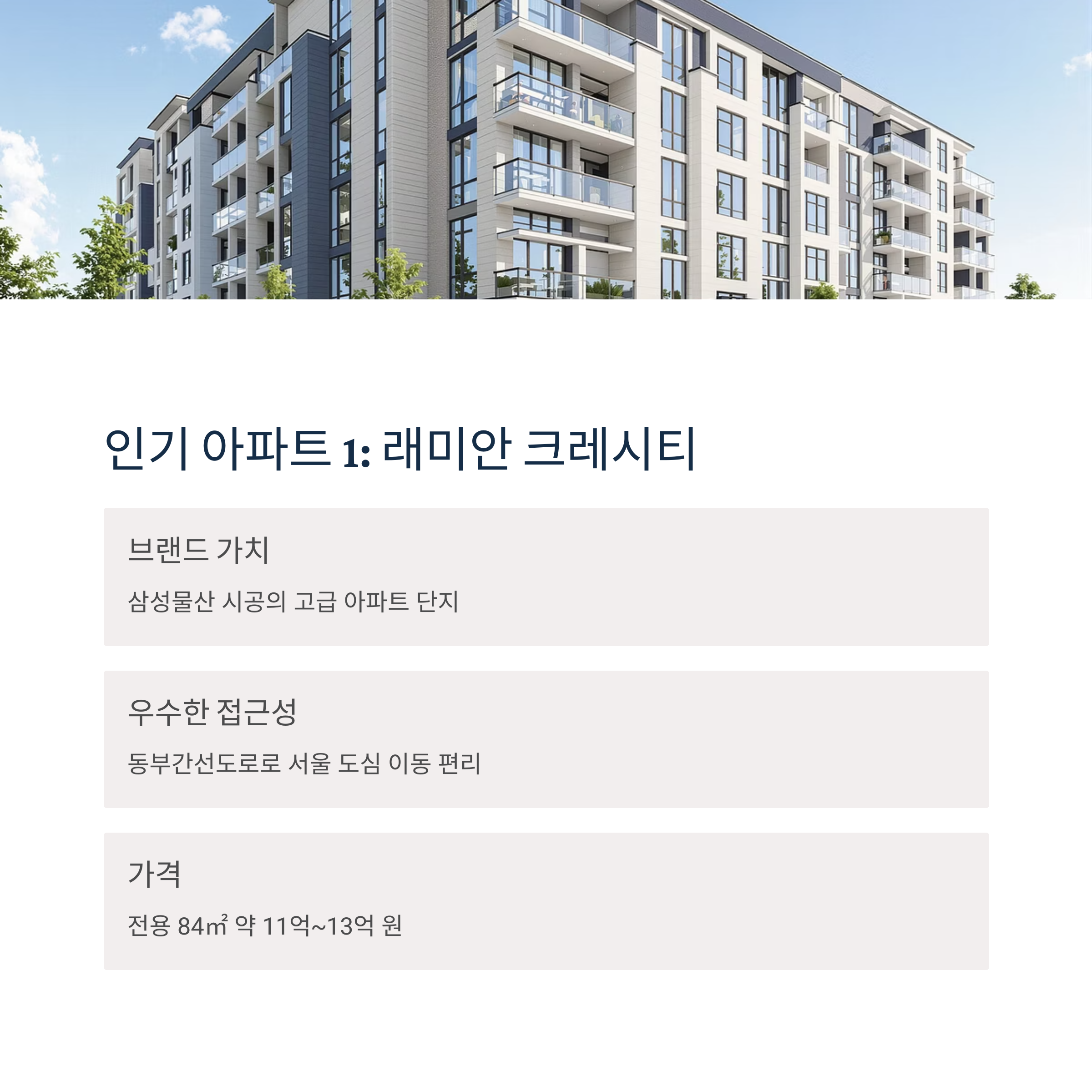 - 단지 내 커뮤니티 시설(피트니스 센터, 도서관 등)과 주거 환경이 우수.