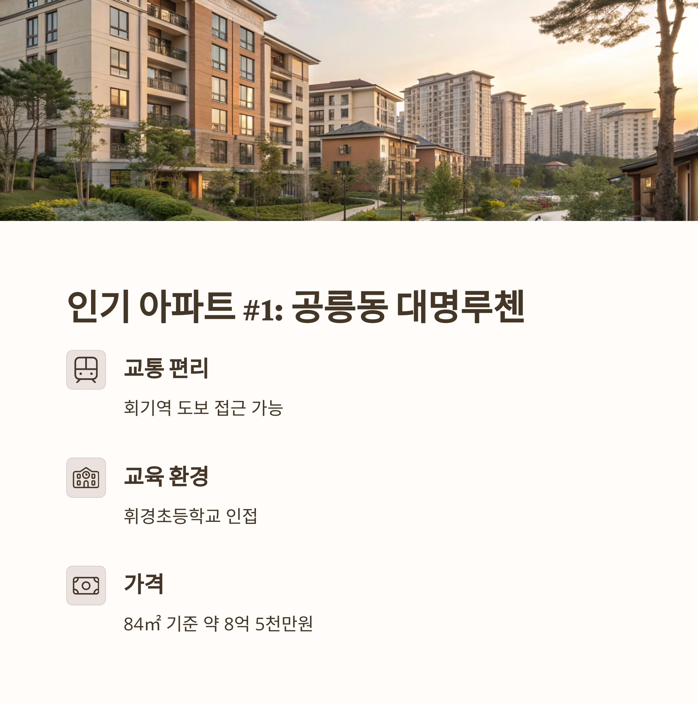동대문구 휘경2동은 서울 동북부 지역에서 꾸준히 주목받는 주거지역 중 하나입니다. 동대문구 휘경2동은 교통, 교육, 생활 편의성 등 다양한 요소에서 강점을 가지고 있어 아파트 수요가 꾸준히 이어지고 있습니다. 그래서 많은 분들이 동대문구 휘경2동 아파트 매매를 검색하고, 투자 또는 실거주를 목적으로 알아보고 계신데요. 오늘은 이 지역의 인기 아파트 순위와 그 장단점, 가격 등 상세한 정보를 카테고리별로 정리해보았습니다.