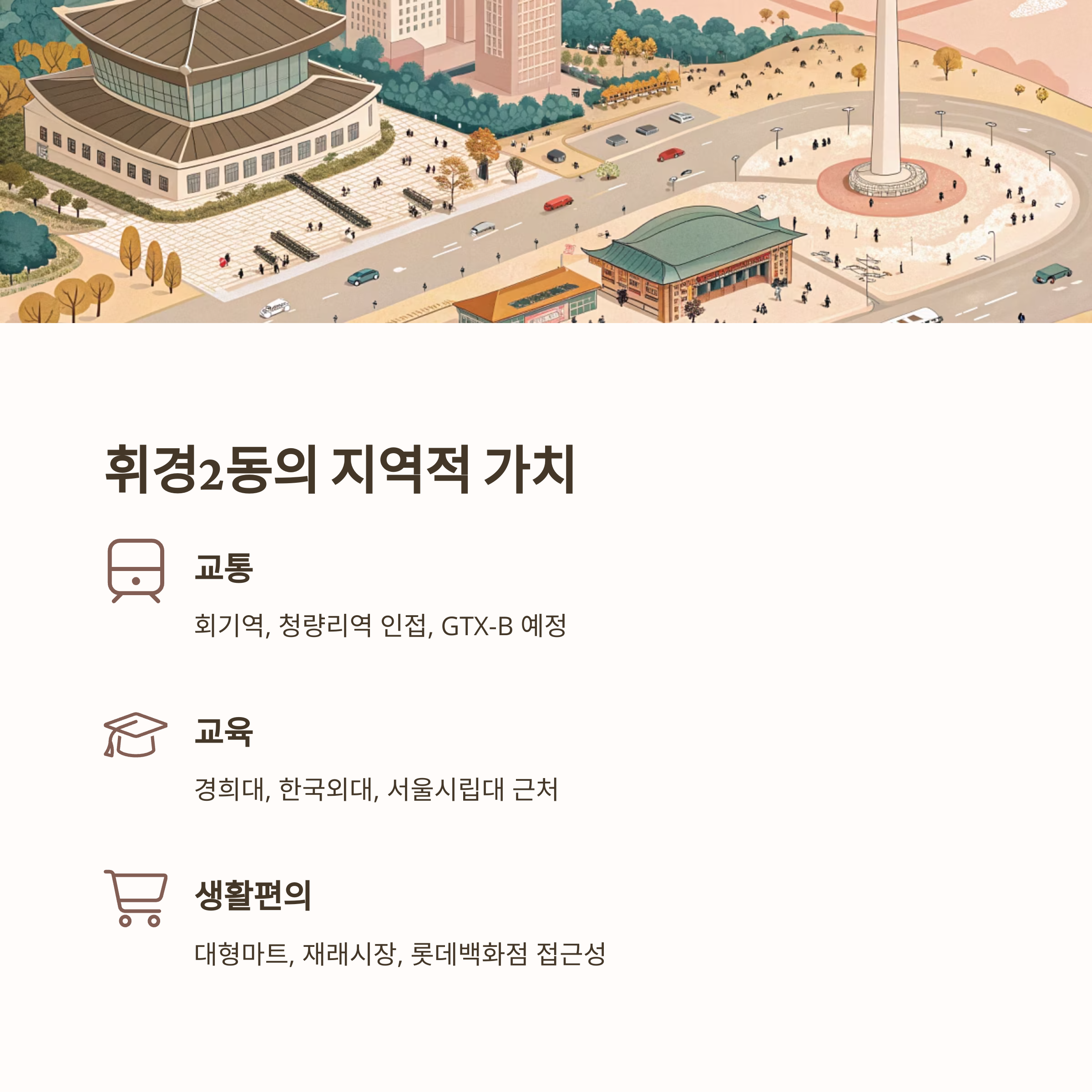 또한, 학생 및 교직원이 많은 경희대 및 한국외대 인근 지역 특성상 임대 수요도 안정적입니다. 따라서 휘경2동은 실거주뿐만 아니라 투자 목적의 접근도 유망한 동네라고 할 수 있습니다.