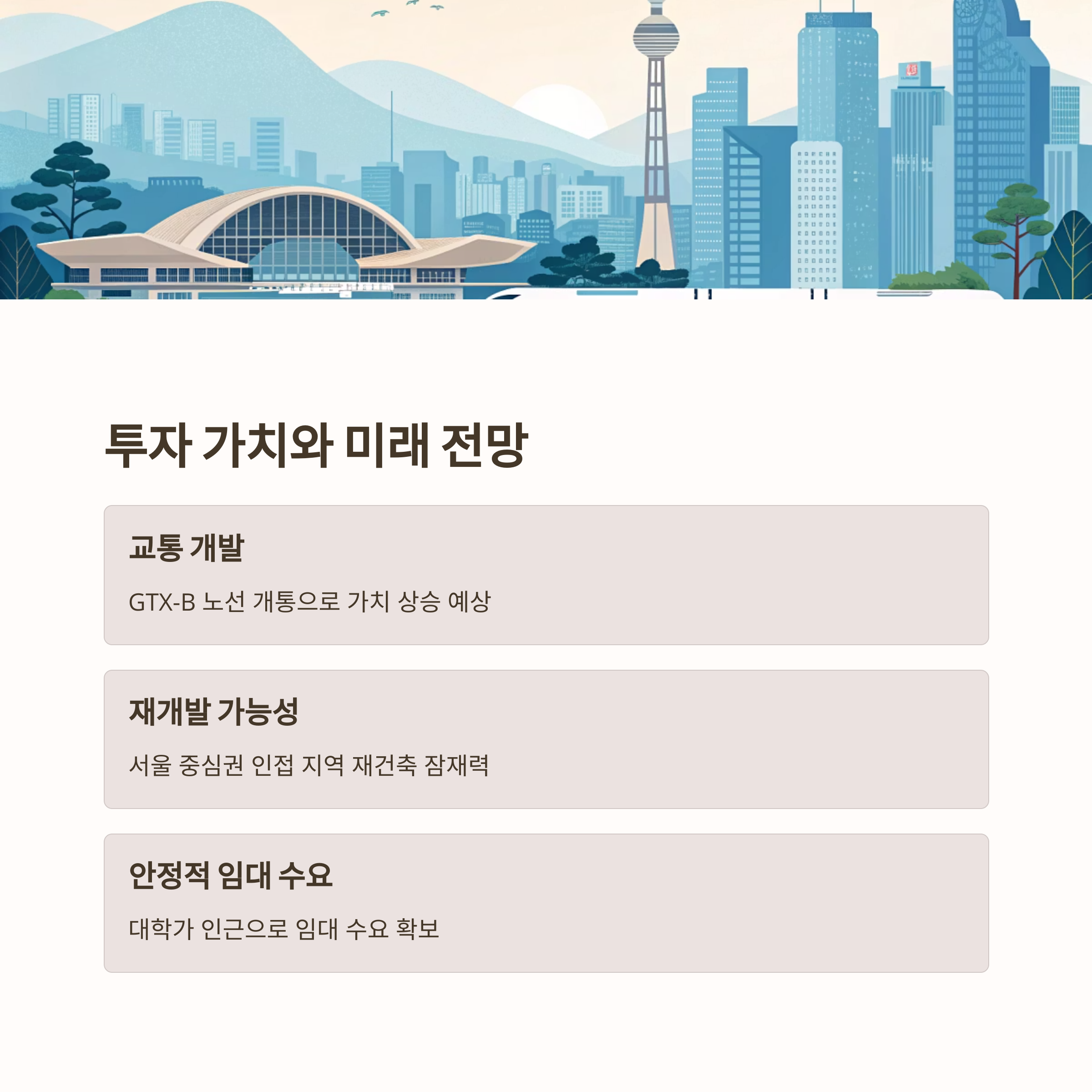 수도권 서북부 지역이 신도시나 대규모 개발지 중심으로 확장되고 있는 가운데, 휘경2동은 서울 중심권과 가까우면서도 재개발, 재건축 가능성이 남아 있는 지역으로 판단됩니다. 특히, 앞으로 GTX-B 노선이 개통되어 교통 여건이 더욱 개선되면 휘경2동의 부동산 가치가 급격히 상승할 가능성이 높습니다.