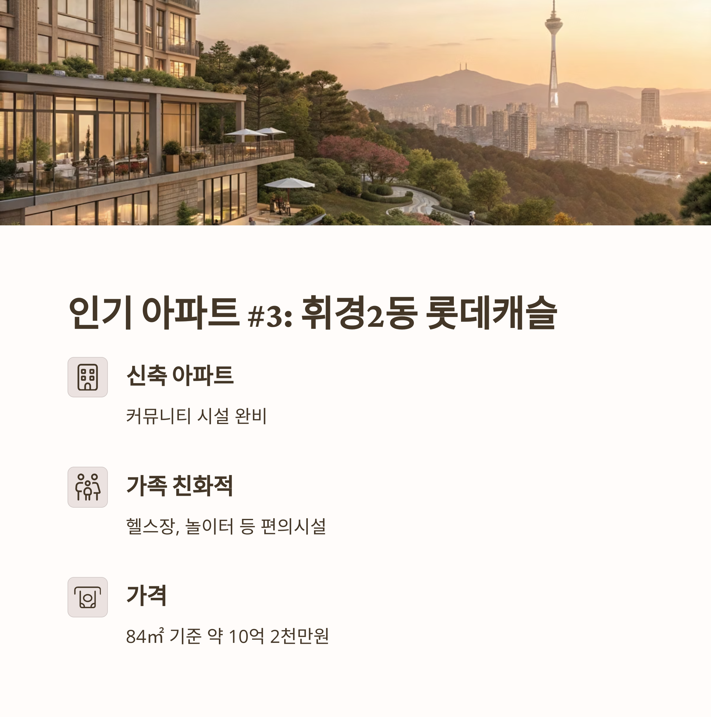 휘경2동 롯데캐슬은 비교적 신축 아파트로 커뮤니티 시설이 잘 갖춰져 있습니다. 단지 내 헬스장, 어린이 놀이터 등 편의시설이 많아 가족 단위 거주자에게 적합합니다. 또한 초고층 형태로 설계되어 탁 트인 조망권을 제공합니다.