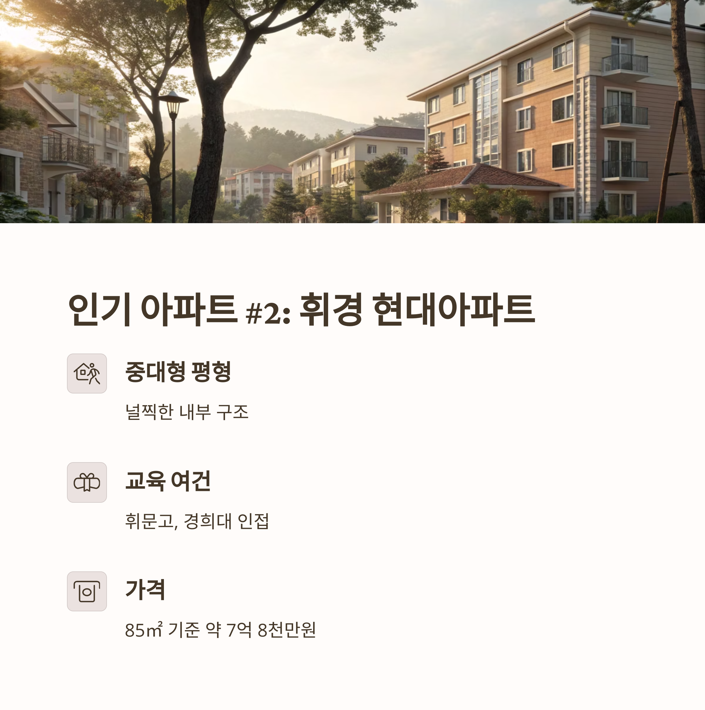 동대문구 휘경2동 아파트 매매의 매력은 무엇보다도 전반적인 생활 조건이 잘 갖춰져 있다는 점에 있습니다. 교통, 교육, 편의시설 등 주거지를 선택할 때 중요하게 고려하게 되는 요소들이 균형 있게 발전해 있는 곳으로, 미래에도 꾸준히 인기를 끌 것으로 예상됩니다. 이제 동대문구 휘경2동 아파트 매매를 고려하시는 분이라면 이 글을 참고하셔서 합리적인 선택을 해보시길 바랍니다."