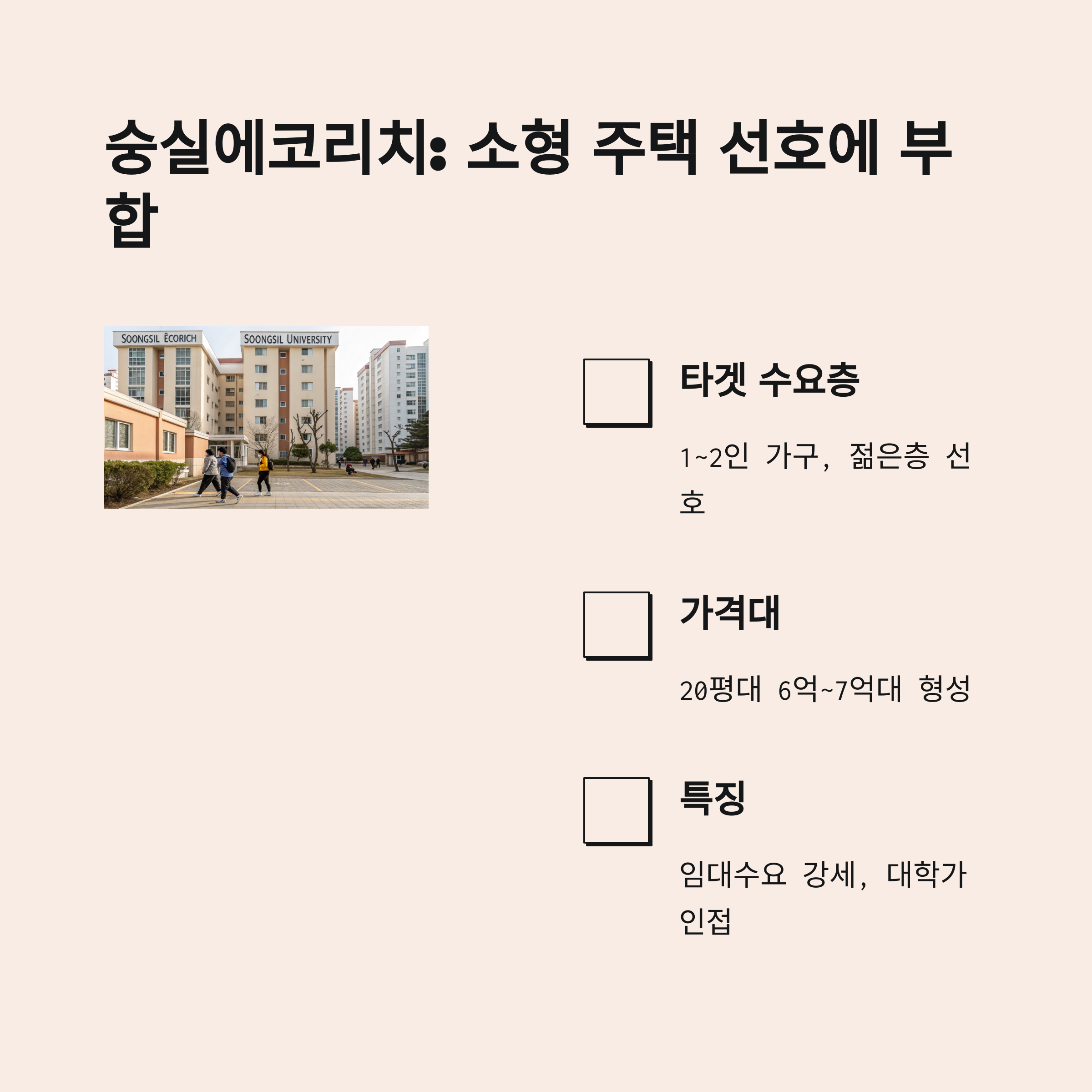 • 장점: 숭실대와 가까워 대학생 및 젊은 층에 매력적인 선택지가 됩니다. 또한 도시형 생활주택과 아파트를 잇는 독특한 형태로 전용 면적은 작아도 공간 활용도가 뛰어납니다.