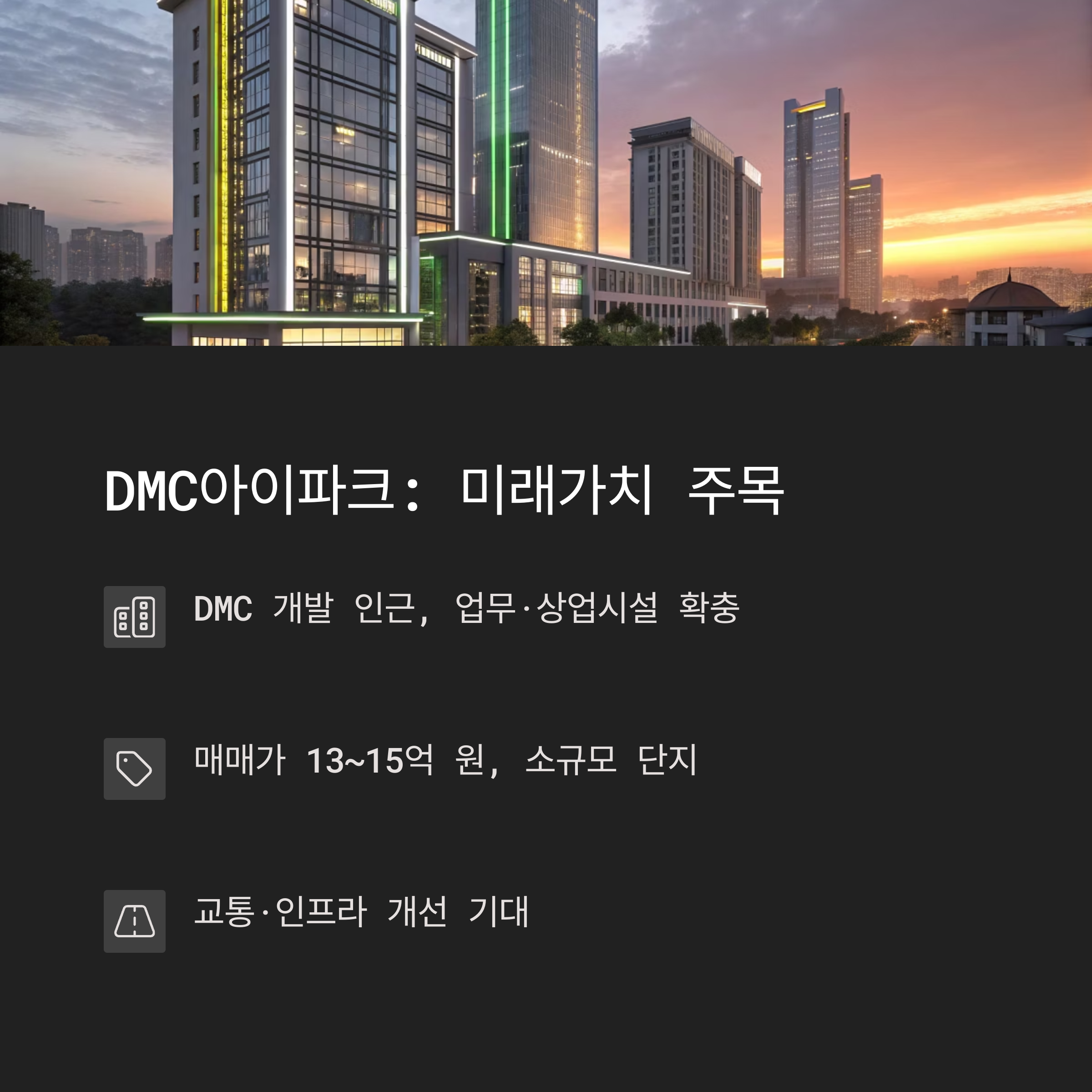1) 미래 가치: DMC(디지털미디어시티) 중심지와 가깝다는 점에서 수요가 꾸준히 유지될 가능성이 큽니다.