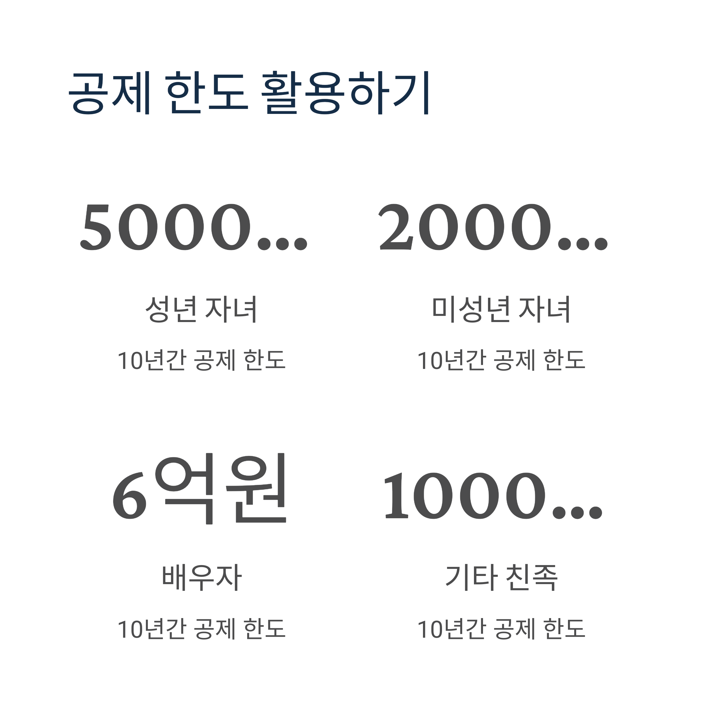 | ① 10년 주기 분산 증여 | 공제 한도 최대 활용 | → 수증자별 공제 적용 |