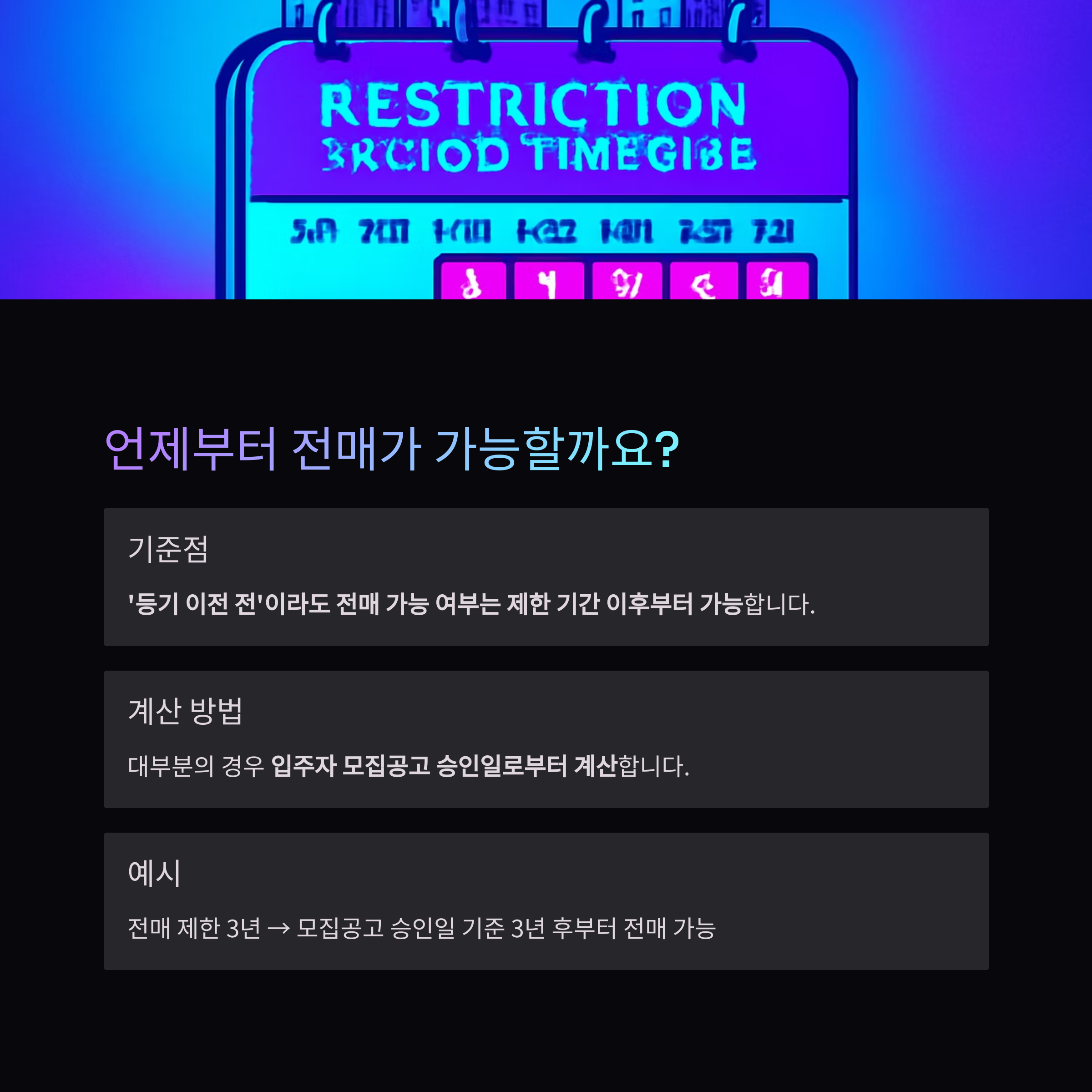 예: 전매 제한 3년 → 모집공고 승인일 기준 3년 후부터 전매 가능