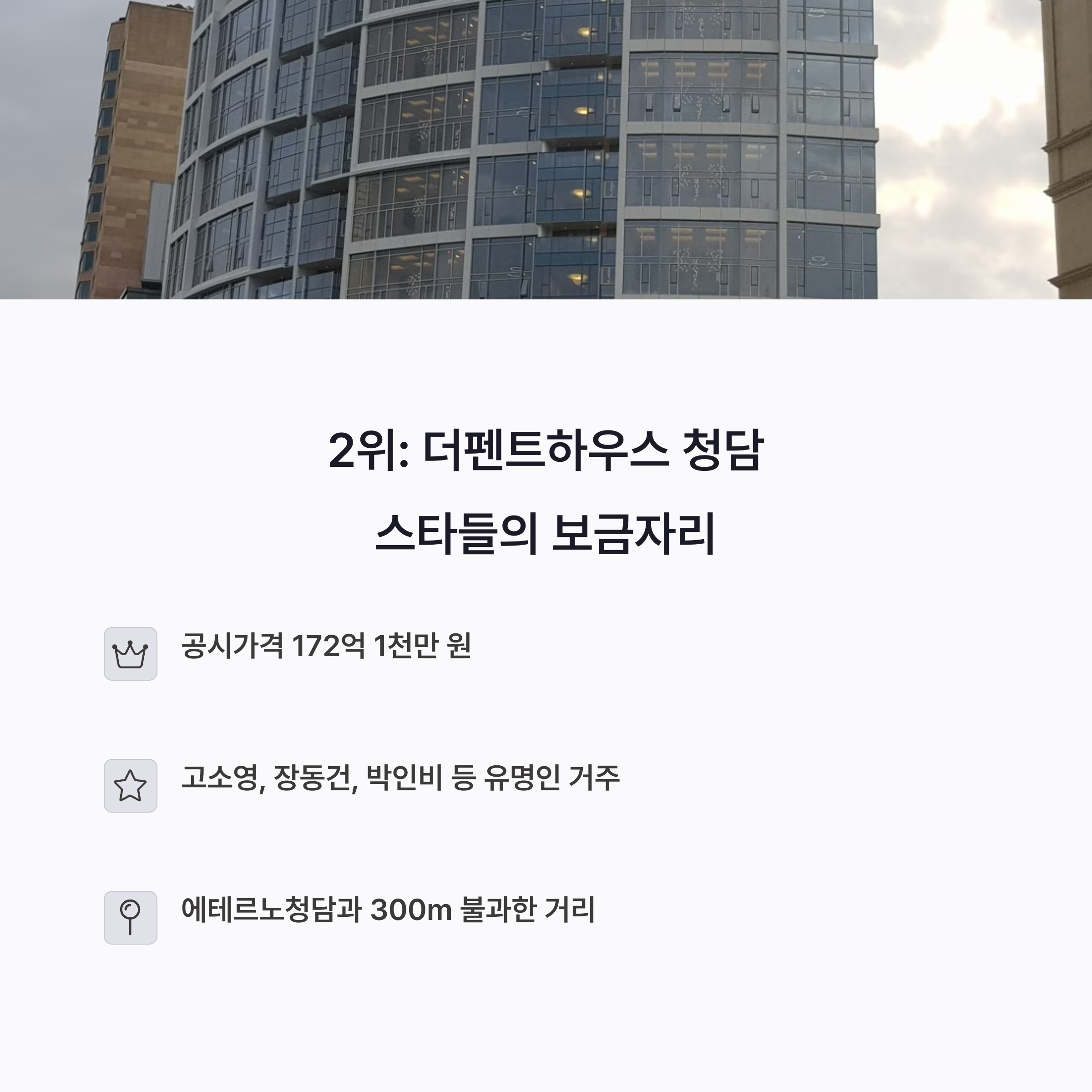- 특징: 청담동에서도 최고급 주거 공간으로 평가받으며, 개인 컨시어지 서비스와 대형 평형 위주의 설계로 입주민들에게 프라이빗한 환경을 제공합니다.