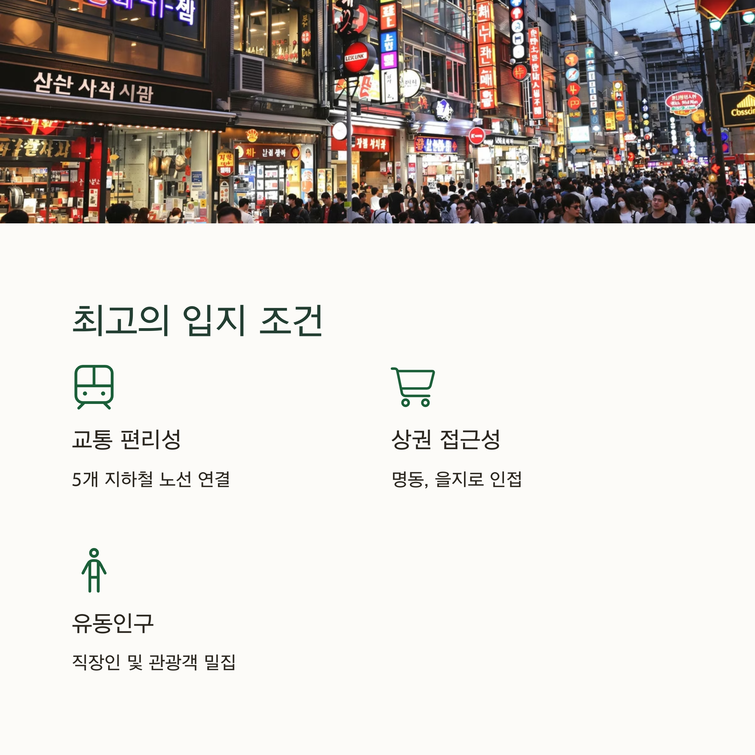 • 문화 및 관광: 명동과 남산타워 등 관광지가 인접해 있어 외국인 관광객 유입이 많습니다.