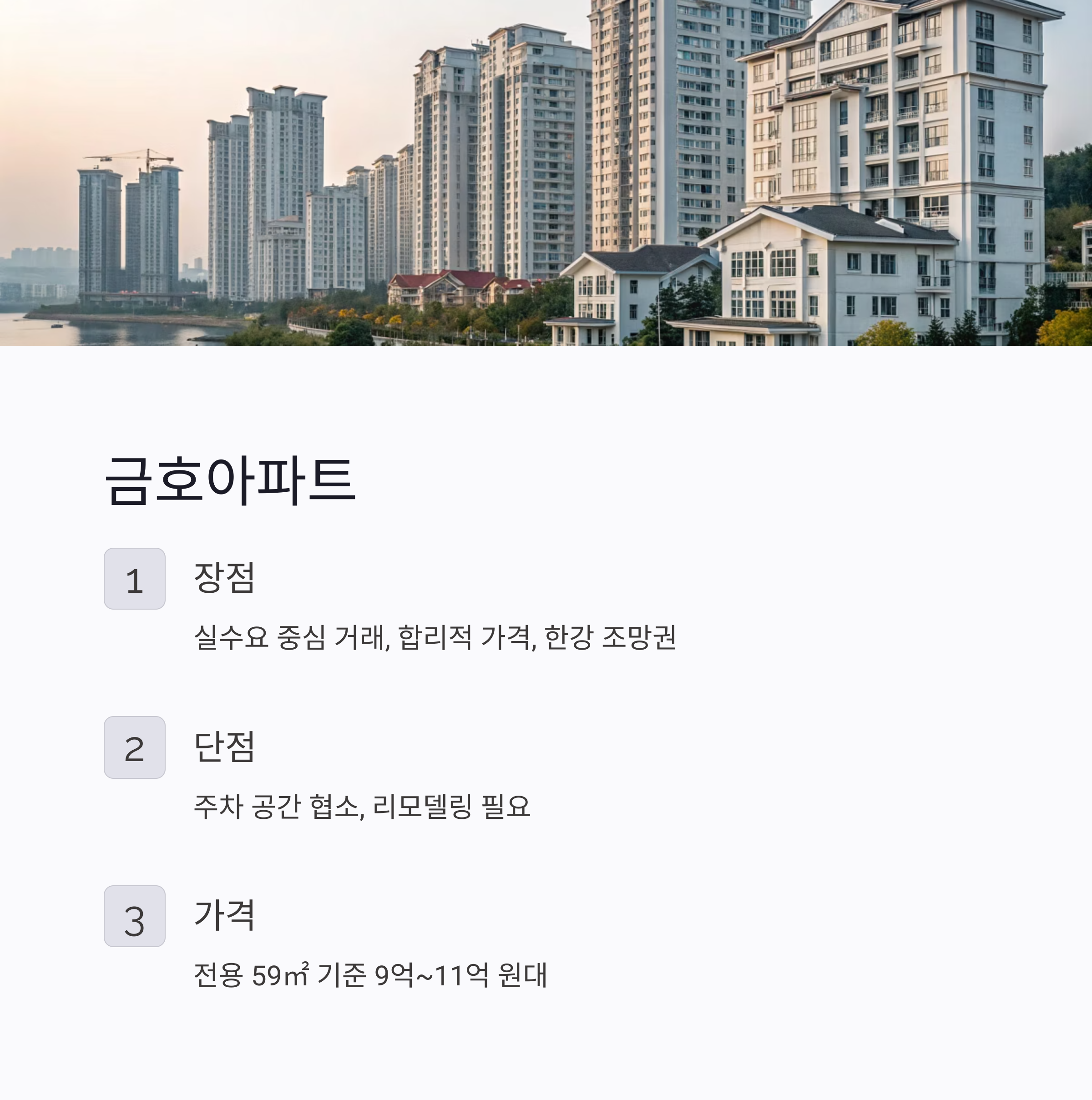 금호아파트는 응봉동 내 오래된 단지 중 하나로, 상대적으로 저렴한 가격대와 실 거주를 목적으로 찾는 구매자들에게 주목받는 곳입니다.