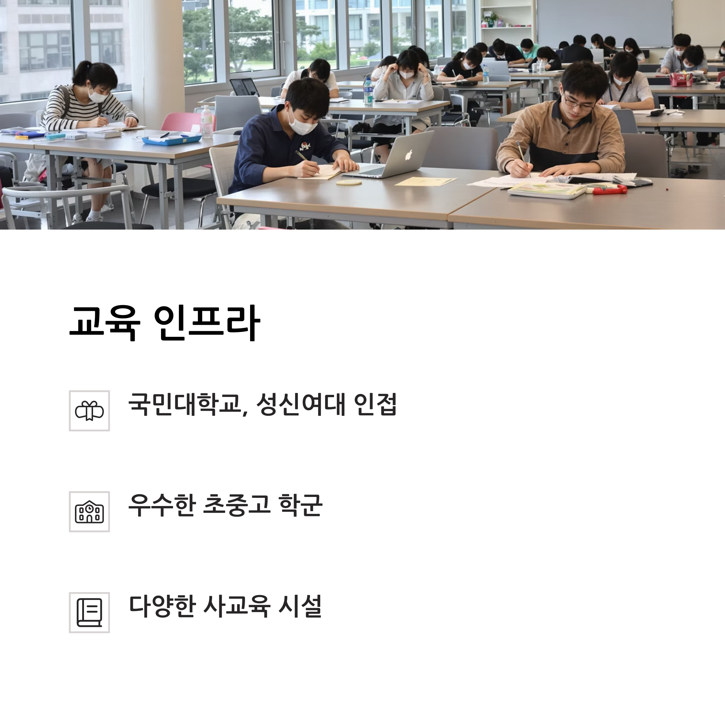 초등학교, 중학교, 고등학교 등 다양한 학군이 존재하며 사교육 시설도 풍부합니다. 대표적으로 국민대학교와 성신여자대학교가 인근에 위치해 교육 중심지로 거듭났습니다.