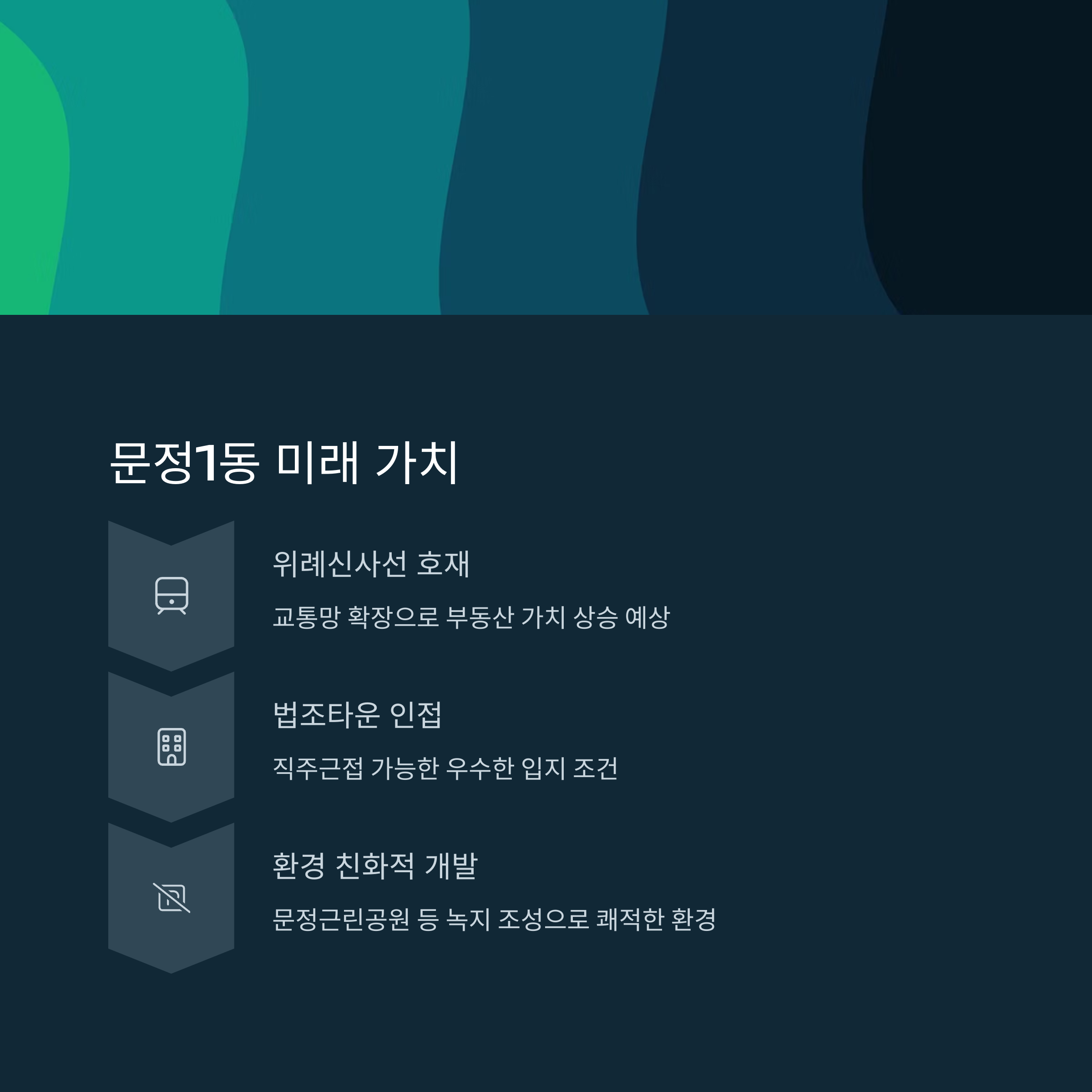 문정1동은 교통, 환경, 그리고 상업시설이 뛰어난 조화를 이룬 지역입니다. 송파구 내에서도 문정1동은 법조타운과 가깝고 업무타운까지 곧바로 연결돼 직주근접이 가능한 조건을 갖췄습니다. 특히, 위례신사선이 호재로 작용하며 송파구 일대의 부동산 가치를 더욱 끌어올릴 것으로 기대되고 있습니다. 이러한 교통망 확장은 향후 추가 아파트 단지 및 주거 수요를 증가시키는 요인으로 작용할 것입니다.