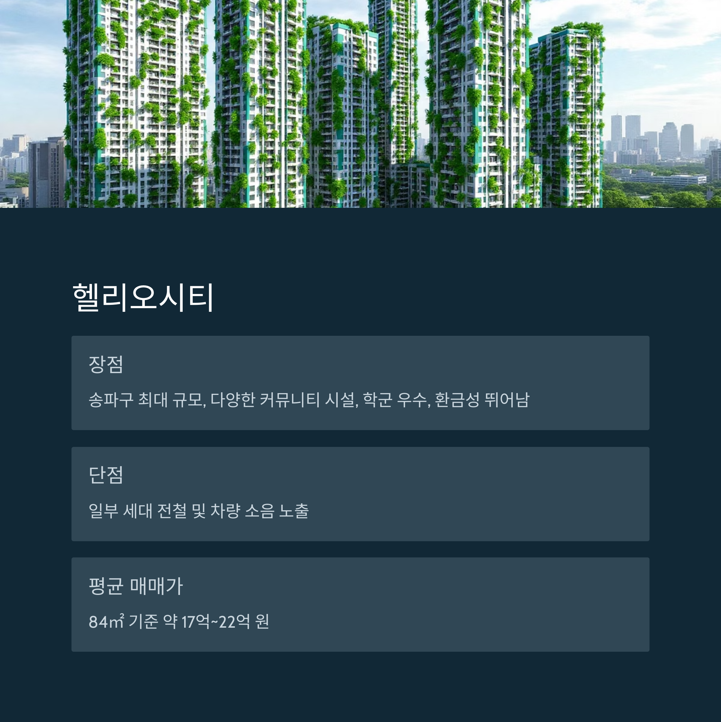 • 장점: 송파구 최대 규모의 단지로 대단지에서 제공하는 다양한 커뮤니티 시설(수영장, 도서관 등)이 강점입니다. 학군, 학원가 접근성이 좋아 자녀 교육을 중시하는 가구가 선호하며, 강남 접근성 역시 우수합니다. 대규모 단지의 특성상 환금성이 뛰어나고 창의적으로 설계된 공간 구조가 돋보입니다.