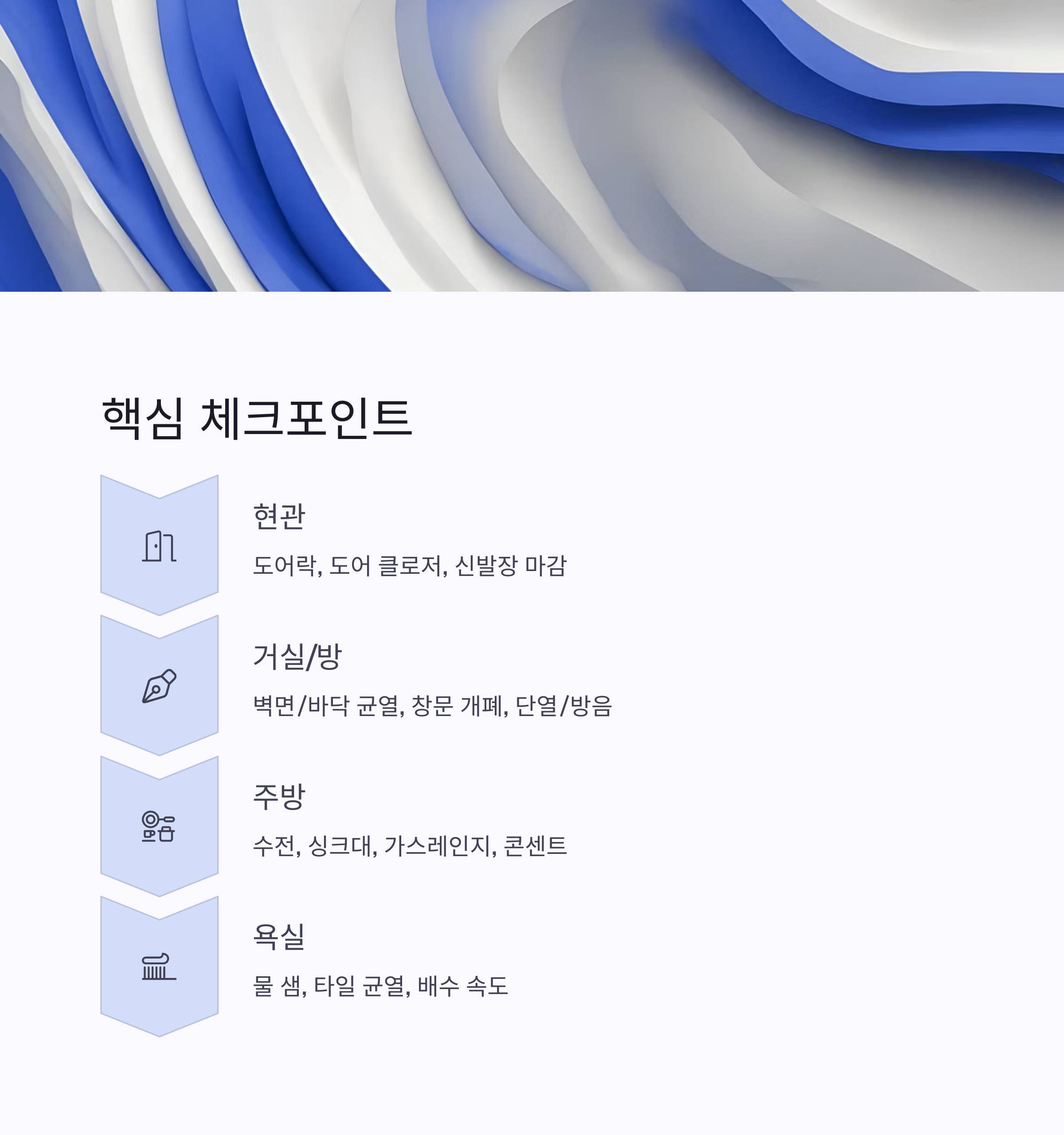 - 벽면/바닥 균열, 벽지 상태, 몰딩 들뜸 여부