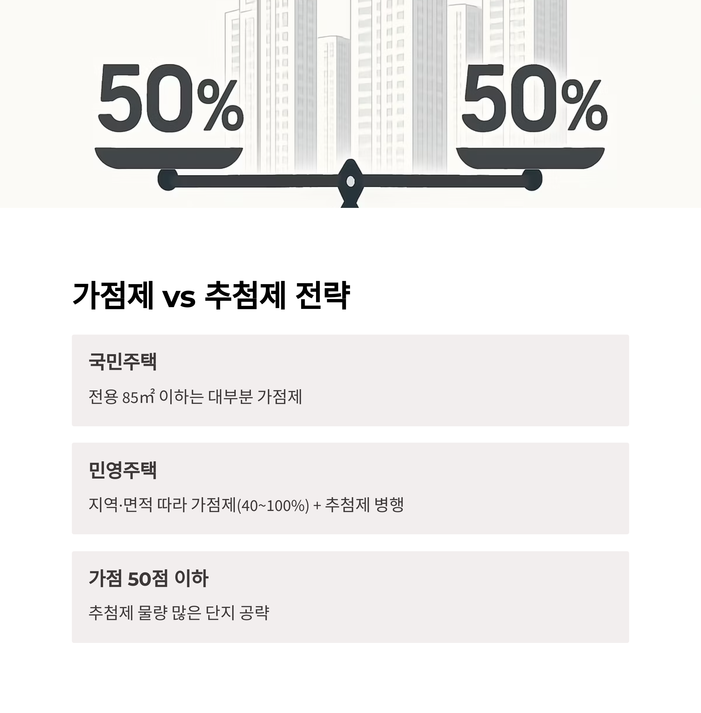 • 민영주택도 지역·면적 따라 가점제(40~100%) + 추첨제 병행