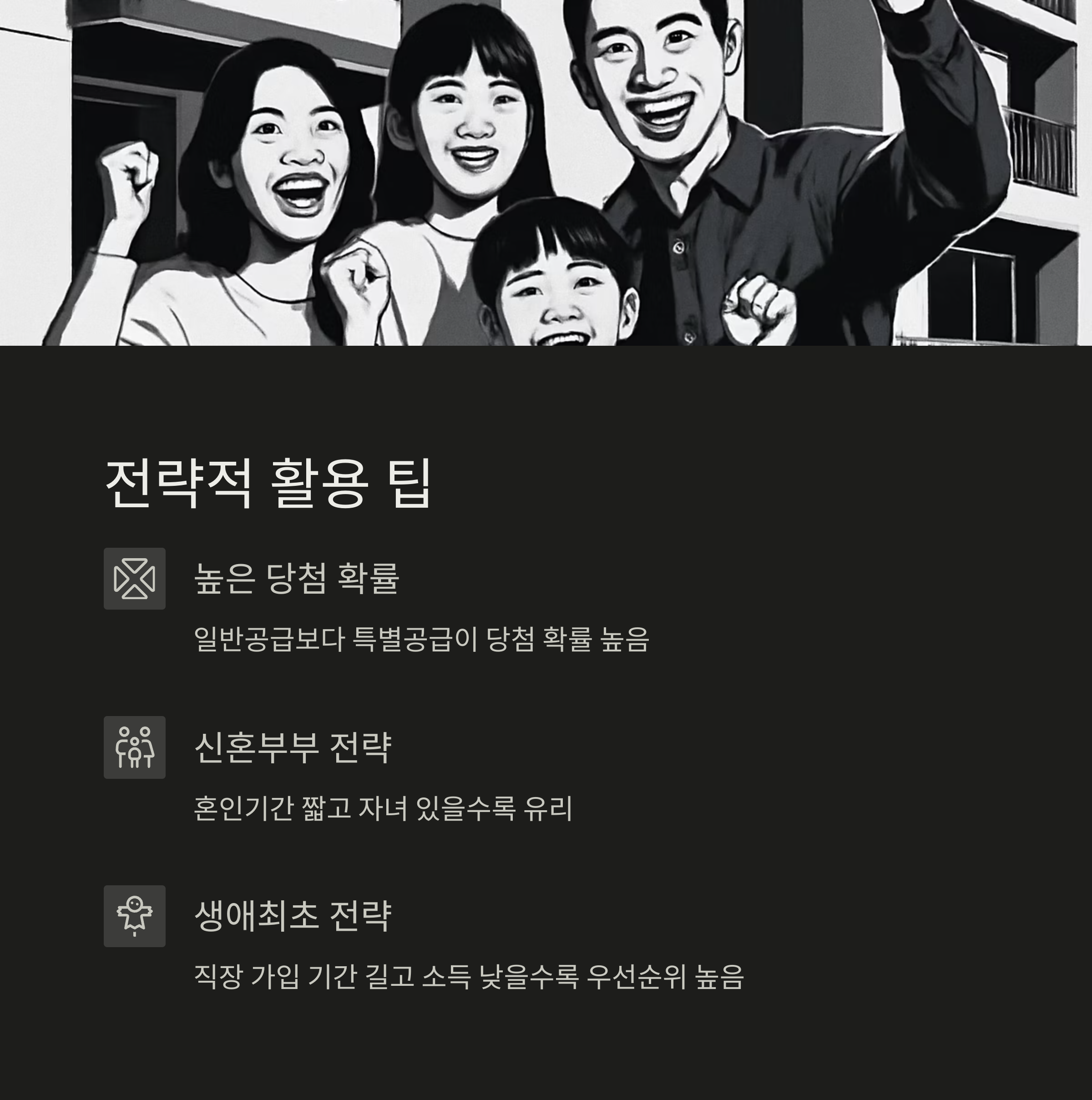 • 경쟁이 치열한 일반공급보다 특별공급 당첨 확률이 훨씬 높습니다.