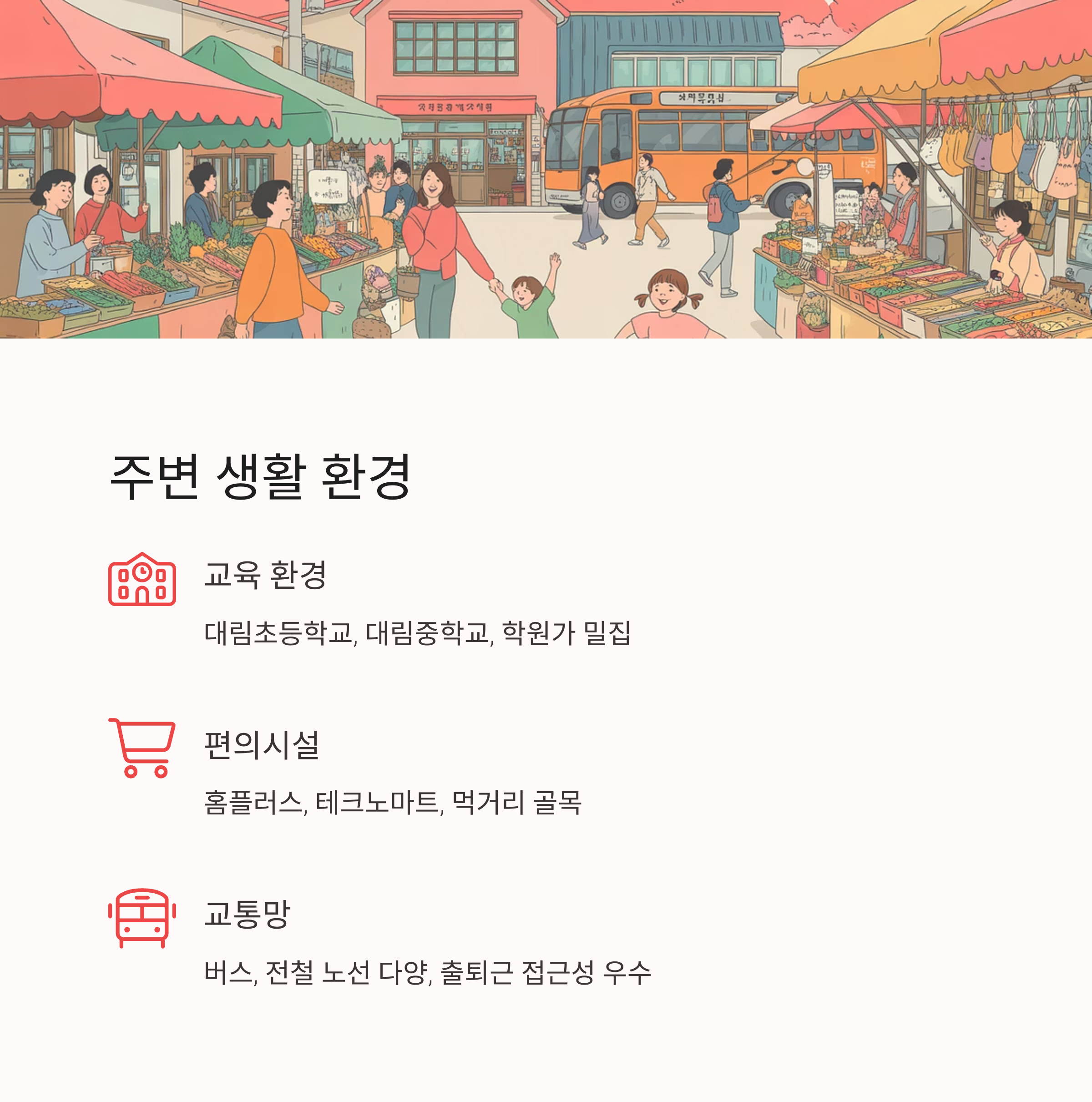 대림초등학교와 대림중학교를 비롯해 다수의 학원가가 밀집해 있어 교육환경이 잘 조성되어 있습니다. 특히, 교육열이 높은 학부모들의 요구를 충족시킬 만한 시설들이 가까운 거리에 있어 가족 단위 수요가 꾸준히 늘고 있습니다. - 편의시설