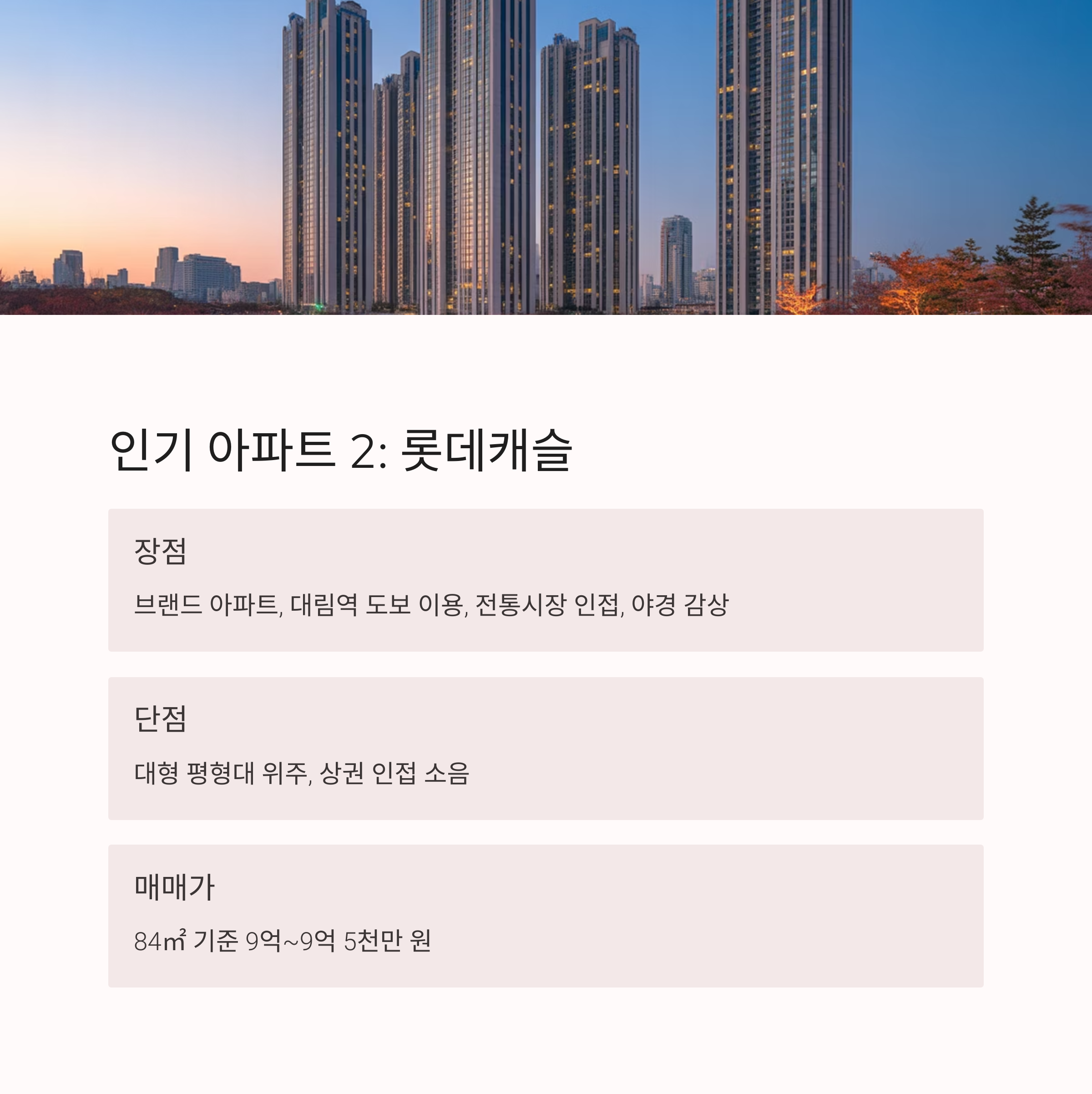 - 장점: 브랜드 아파트로 안정성 있는 관리 서비스와 고급 마감재로 신뢰를 주는 단지입니다. 대림역을 도보로 이용할 수 있어 출퇴근에 유리하며 주변에 있는 전통시장과 상점가로 생활 편의도 높습니다. 무엇보다 고층 세대에서는 영등포 지역의 야경을 감상할 수 있다는 점이 매력 포인트입니다.