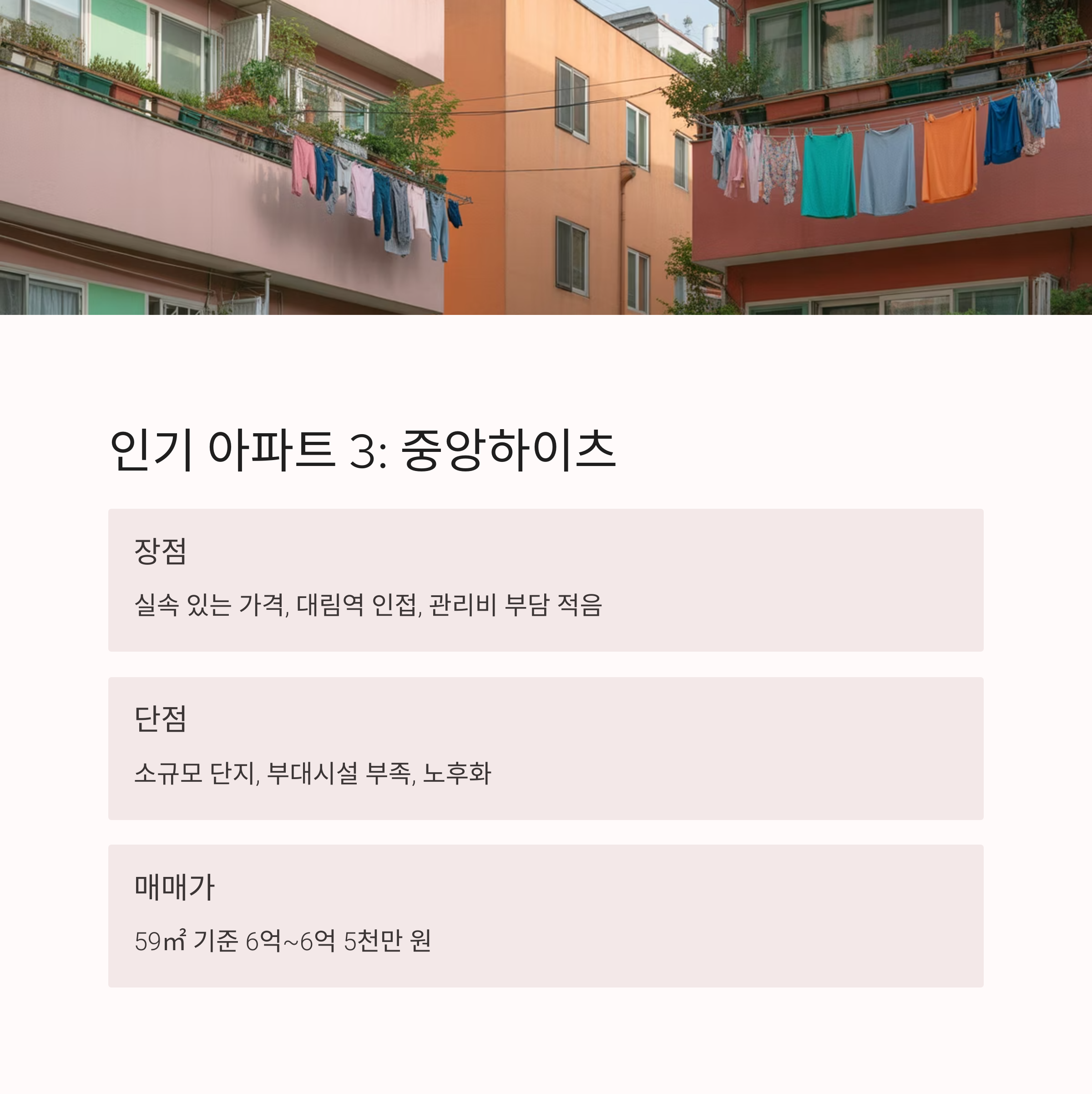 - 장점: 실속 있는 가격대와 더불어 대림역과 가까워 교통이 편리합니다. 중소형 평형대로 이루어져 신혼부부나 작은 가구 수가 선호하는 아파트입니다. 관리비 부담이 상대적으로 적고, 주변 학군도 우수하다는 평가를 받고 있습니다.
