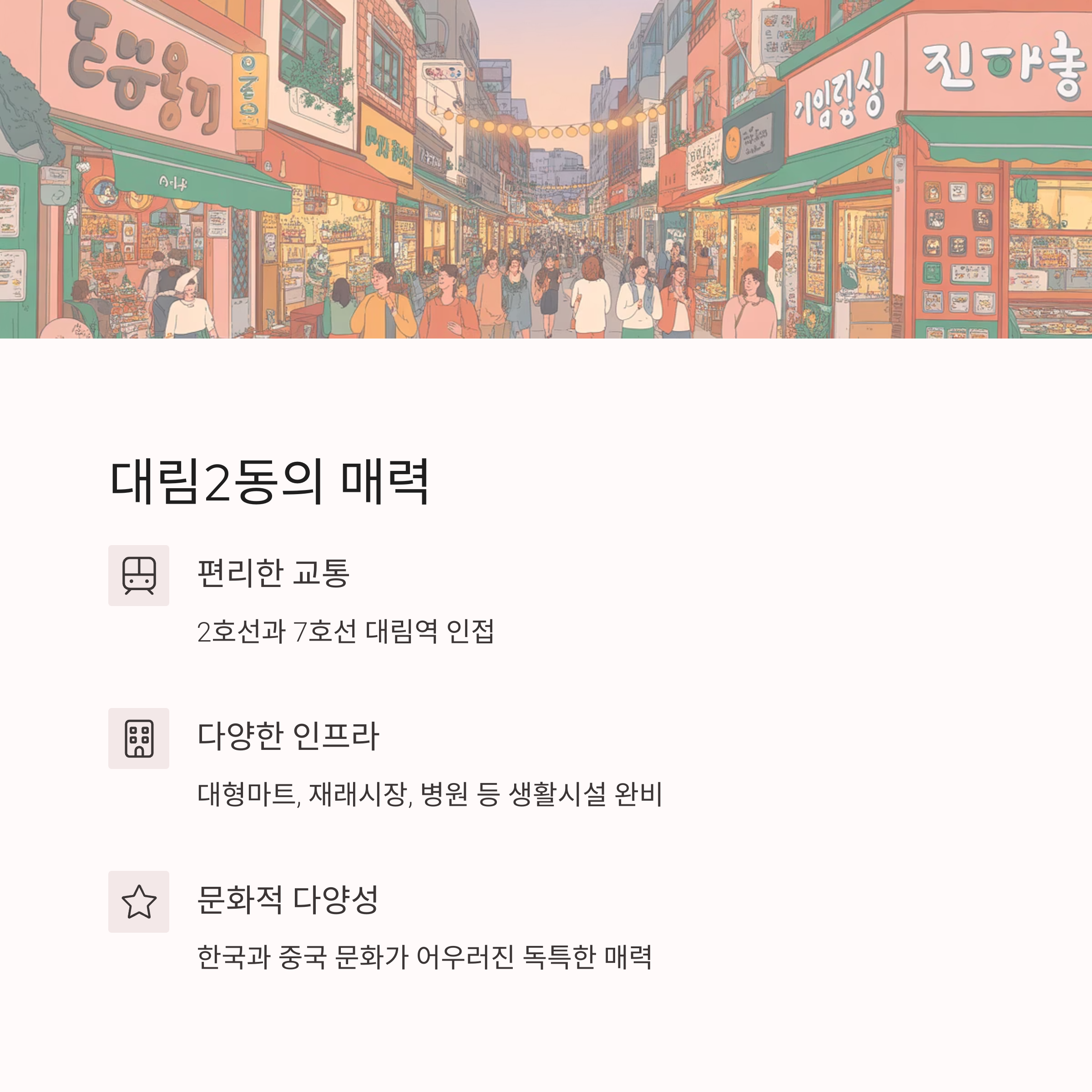 현재 대림2동 인근 지역은 중소규모의 재개발 및 리모델링 프로젝트가 진행 중입니다. 이런 도시 정비는 해당 지역 부동산 가치를 상승시키는 요인으로 작용하게 됩니다. - 생활 인프라 및 문화적 다양성