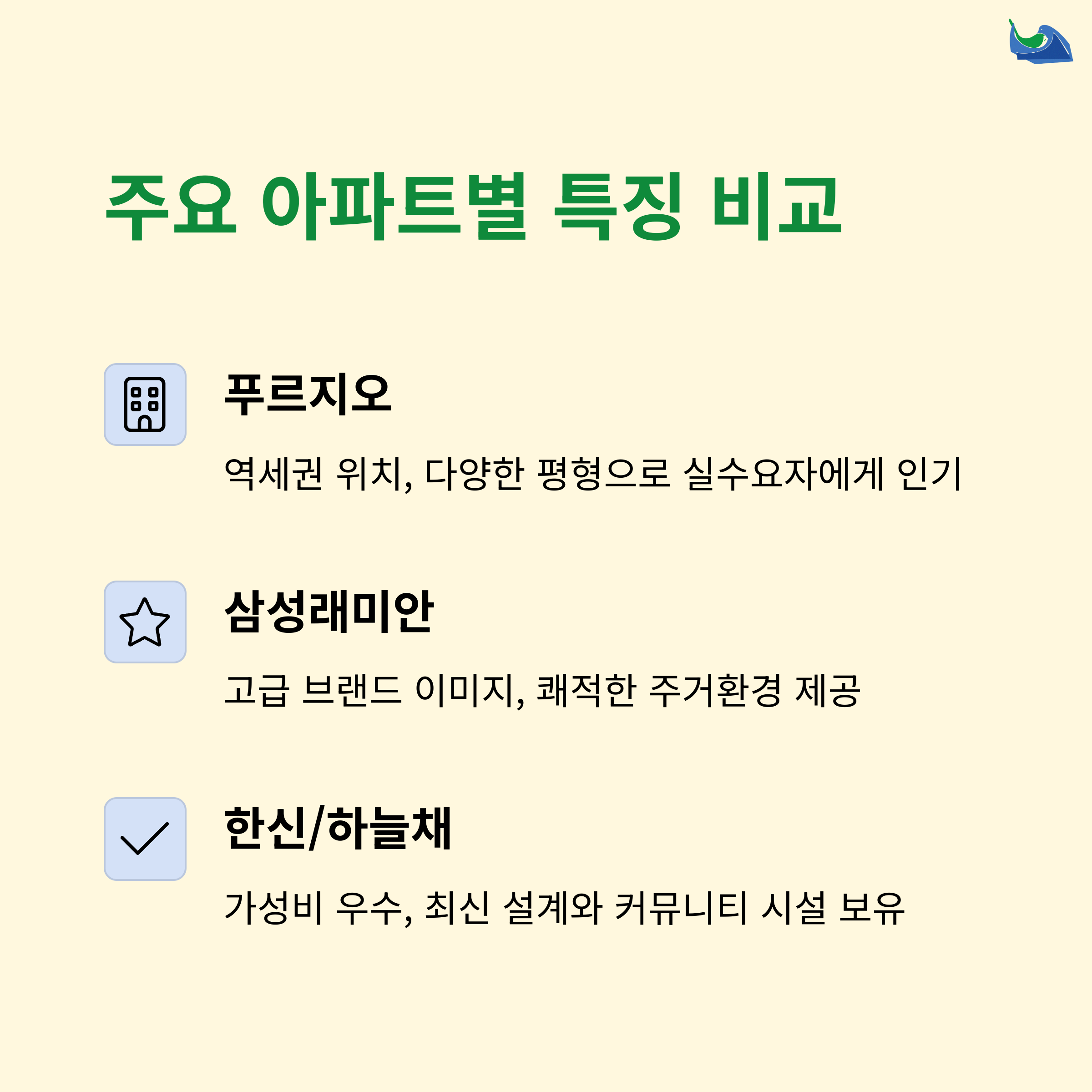5. 이들 각각은 특장점이 뚜렷하며, 매매 가격대와 세대 구성이 조금씩 다릅니다.