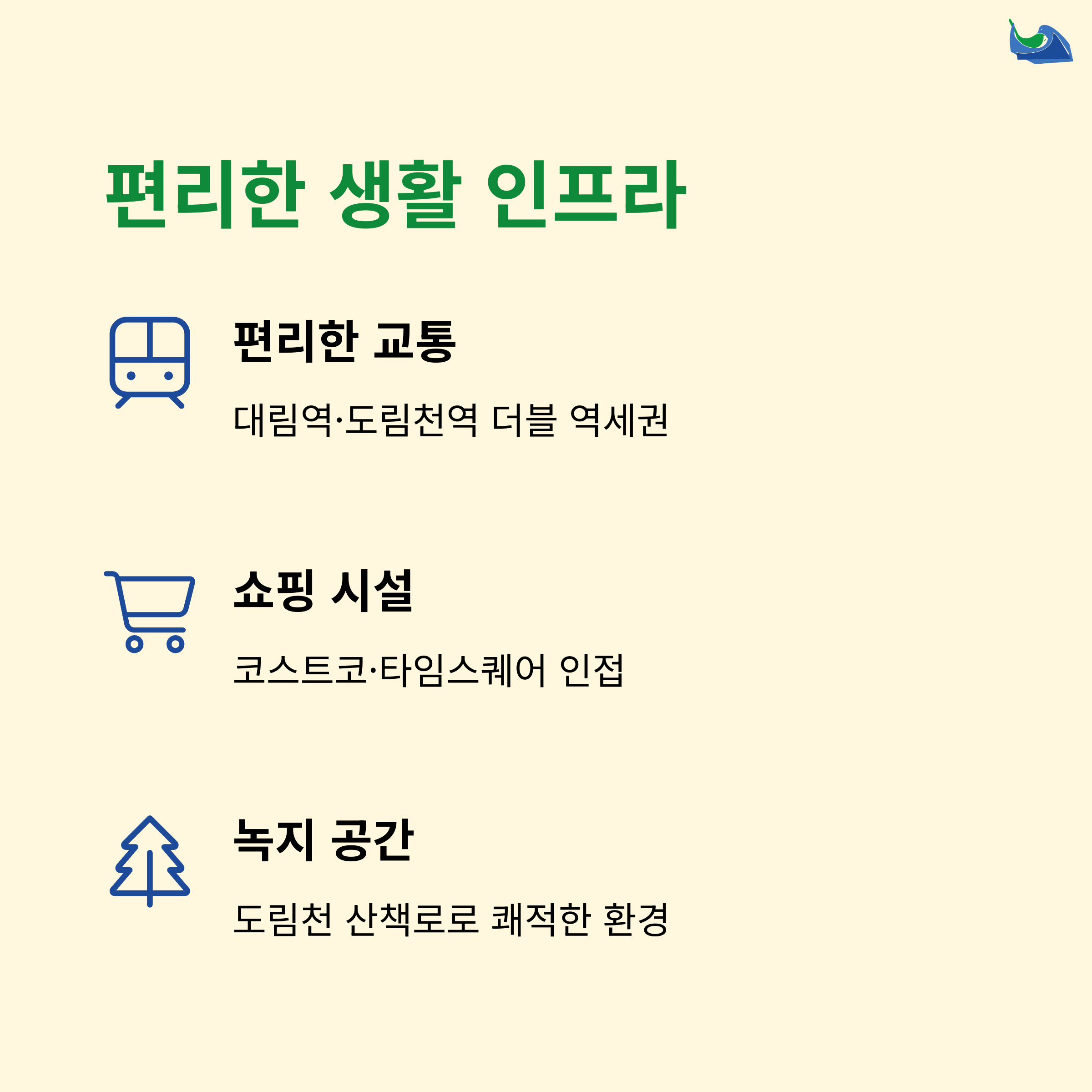 코스트코와 타임스퀘어 영등포가 차로 10분 내에 위치해 있어 쇼핑과 문화생활을 동시에 누릴 수 있습니다. 근처 재래시장, 마트 등도 입주민의 생활을 편리하게 만들어줍니다.