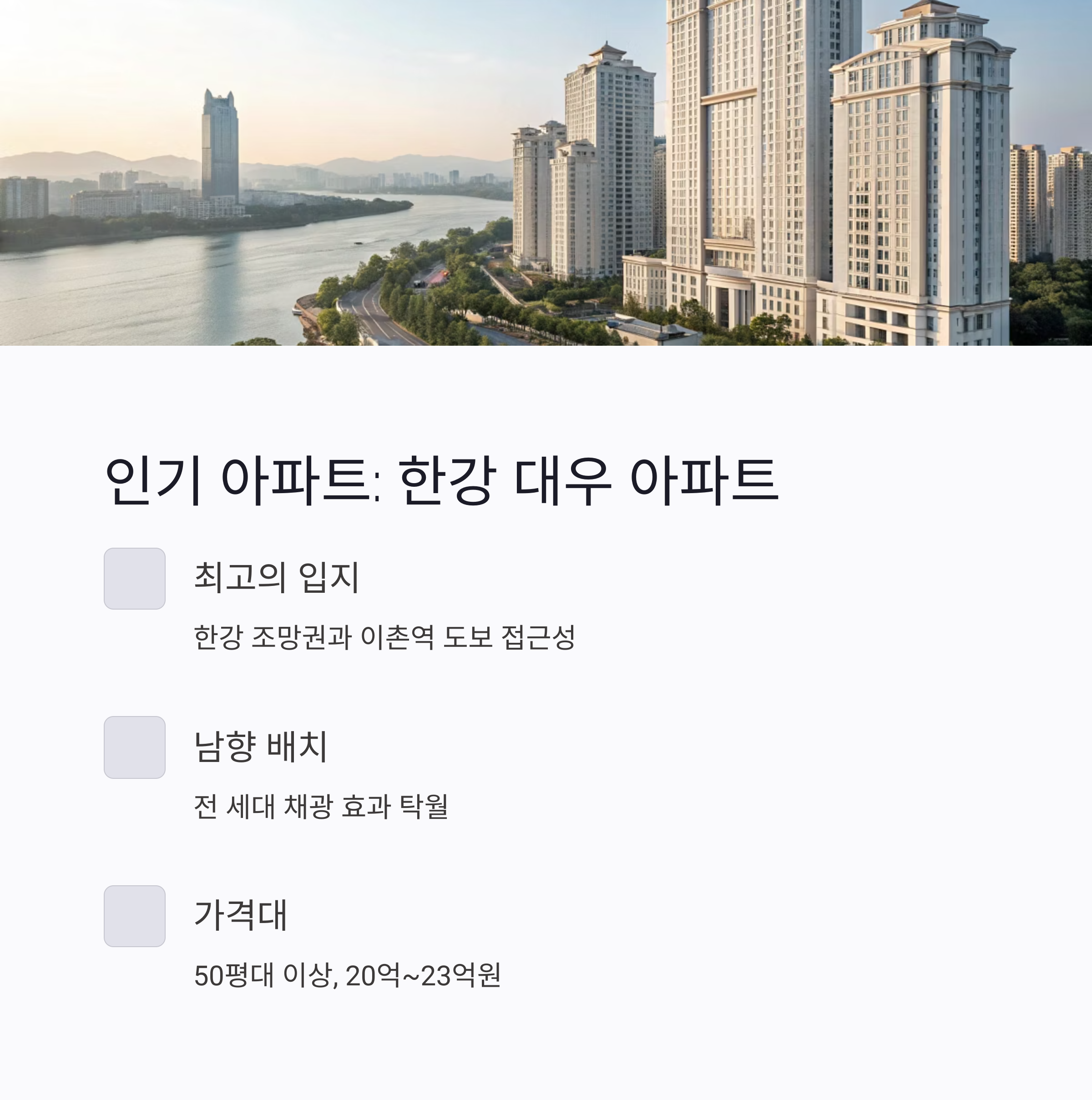한강을 바로 앞에 둔 한강 대우 아파트는 입지가 매우 뛰어나고, 평수가 넓어 대형 평형 선호 고객들에게 인기가 높습니다.