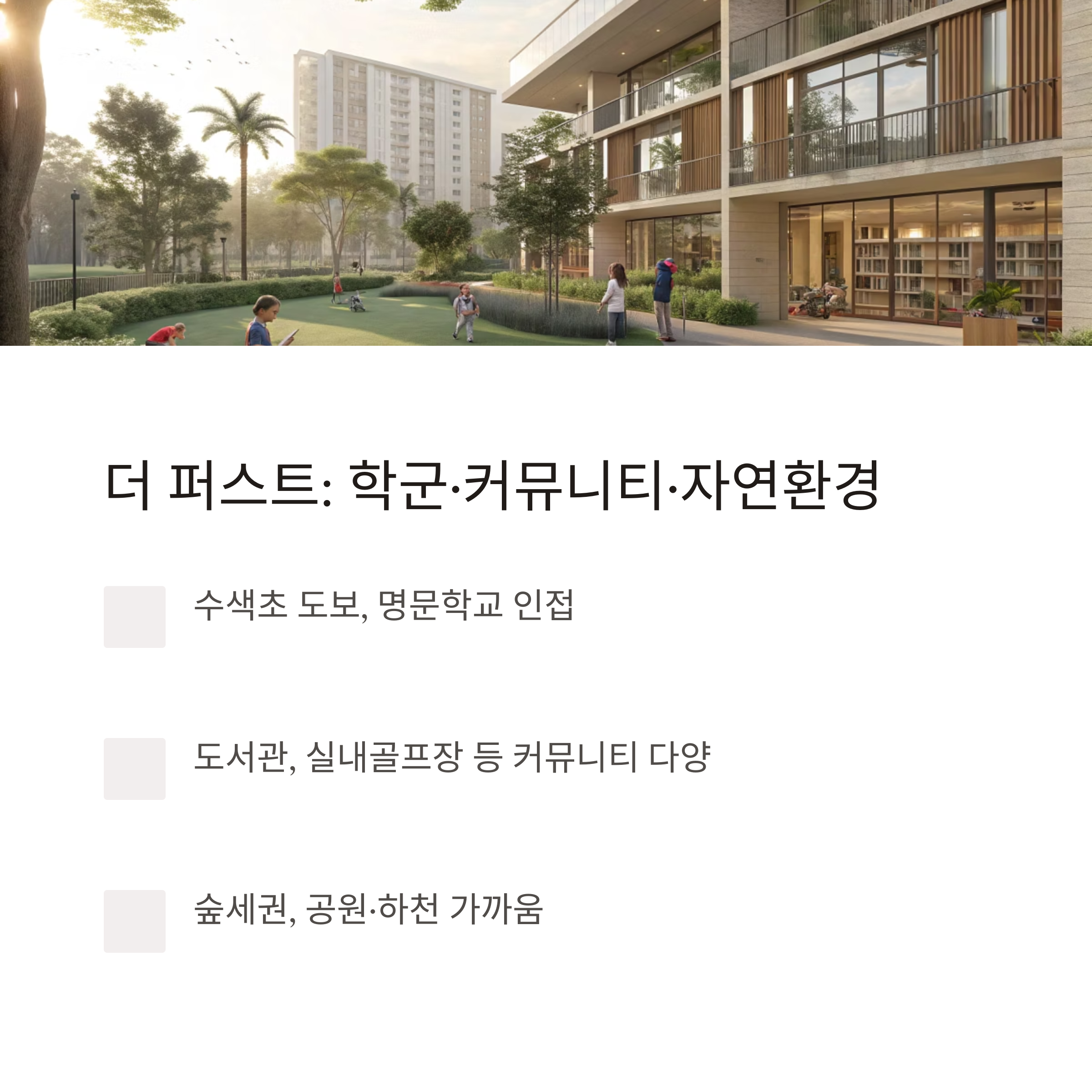 - 장점: 초역세권 입지, 유명 학군(명문 초·중학교 인접), 주민 커뮤니티 시설 우수