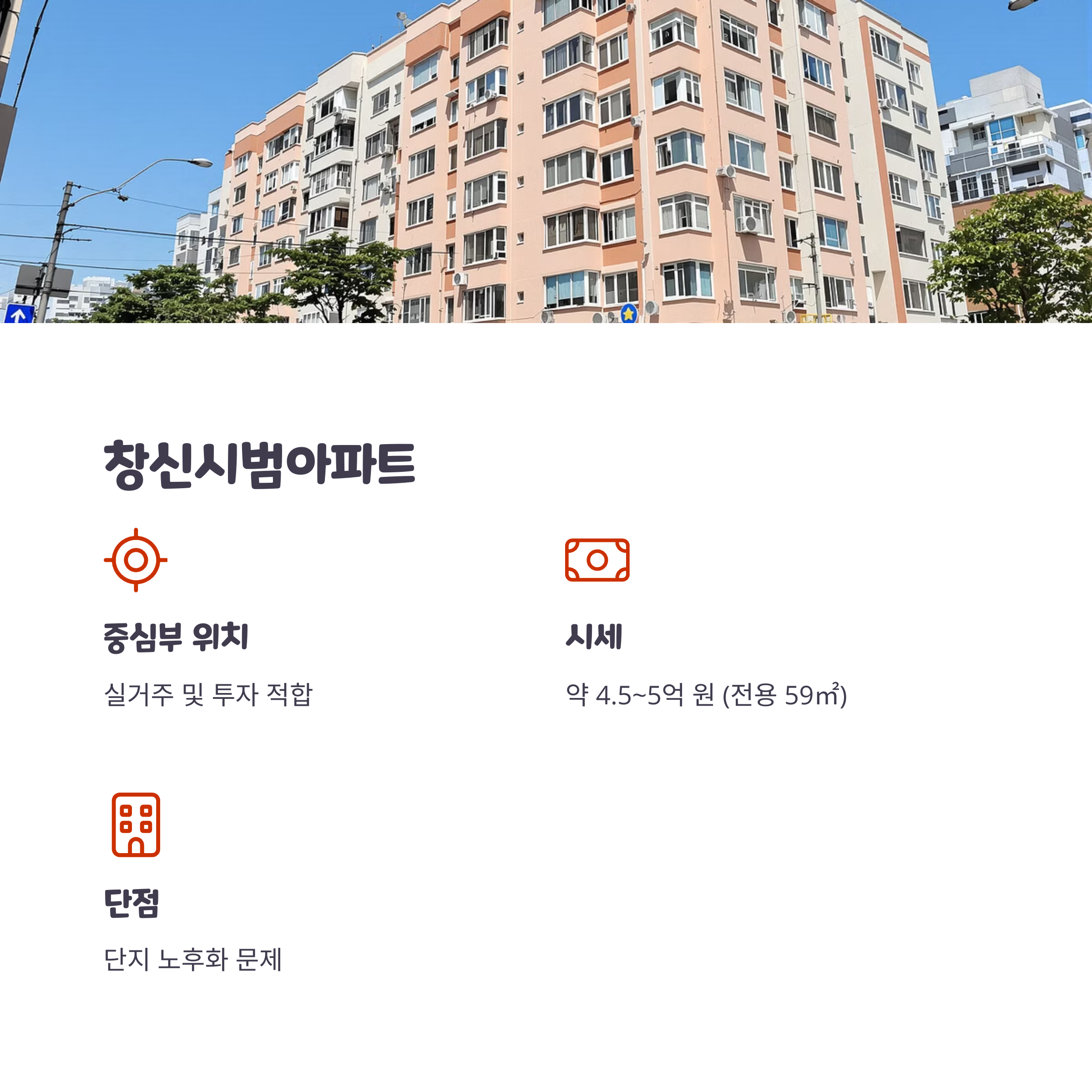 - 실거주 및 투자 목적으로 적합한 비교적 저렴한 매매가