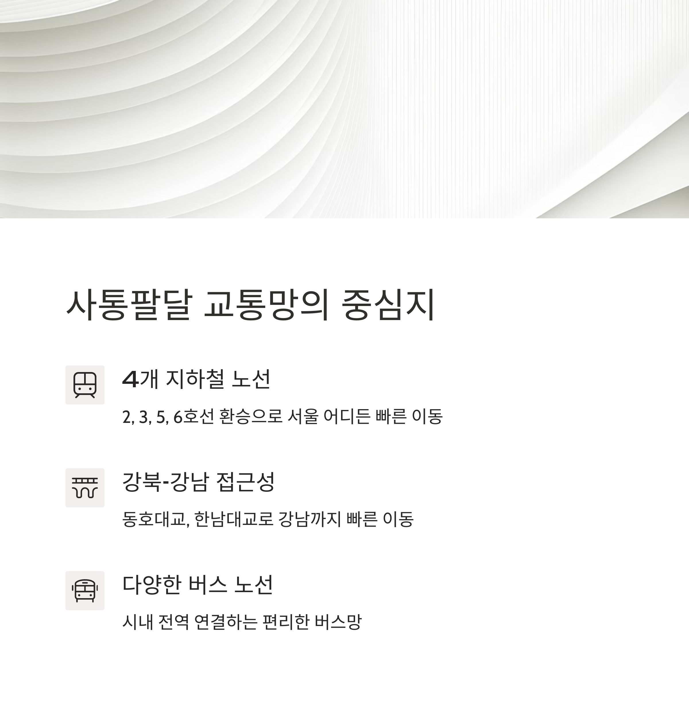 • 높은 접근성: 강남, 마포, 종로 등 다른 핵심 지역들로 가는 접근성이 우수하여 교통 요지로서의 역할을 톡톡히 하고 있습니다.