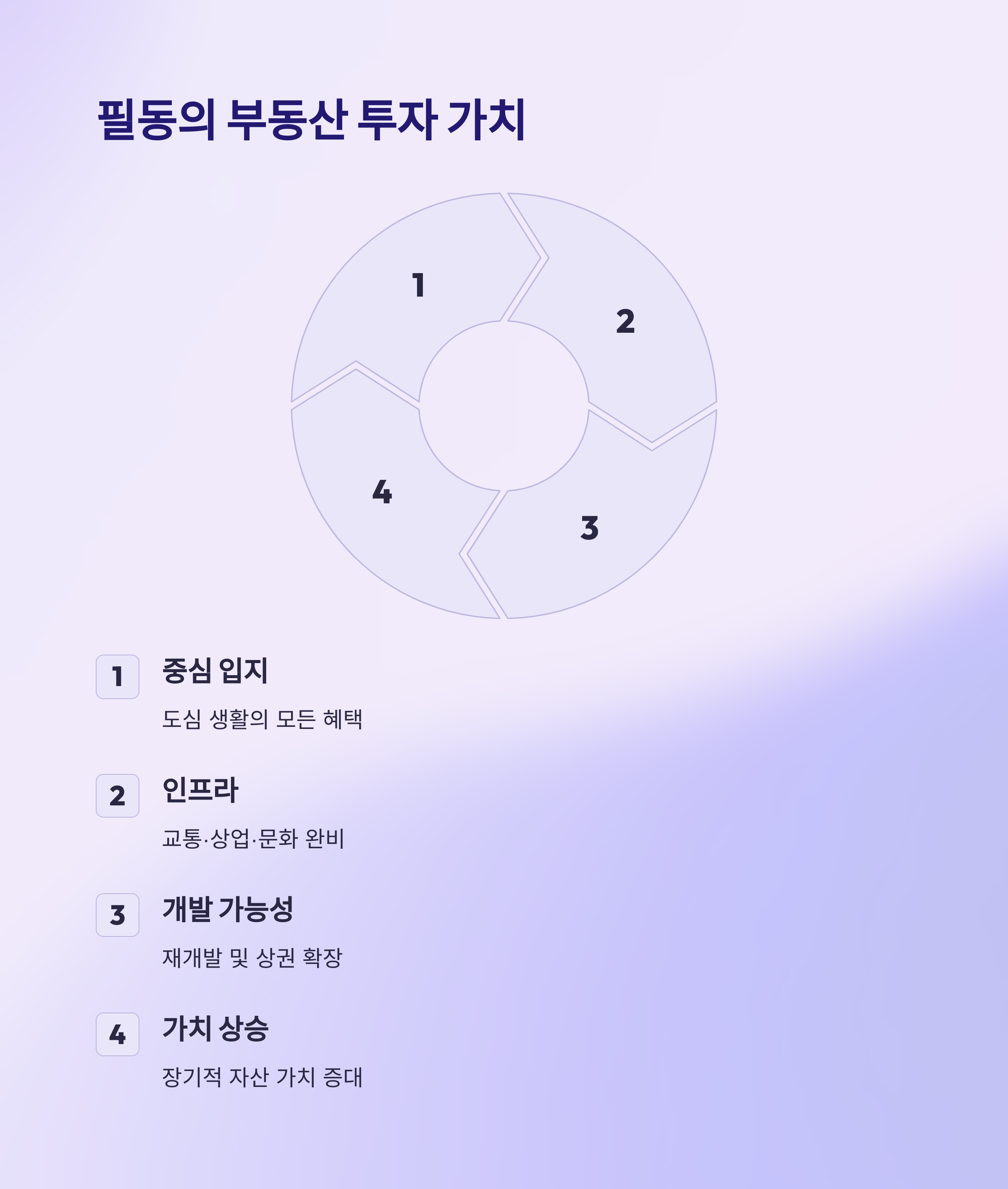 추가로, 필동은 서울 내 주요 상업, 문화 지구와 가까우면서도 남산을 중심으로 한 쾌적한 주거 환경을 갖추고 있습니다. 이처럼 업무 및 생활 인프라가 잘 갖춰져 있기 때문에 중장기적인 부동산 가치 상승 가능성이 높습니다. 향후 남산과 을지로 재개발 및 상권 확장 사업이 완료되면 인프라 역시 더욱 업그레이드되어 주거 가치가 더욱 높아질 전망입니다.